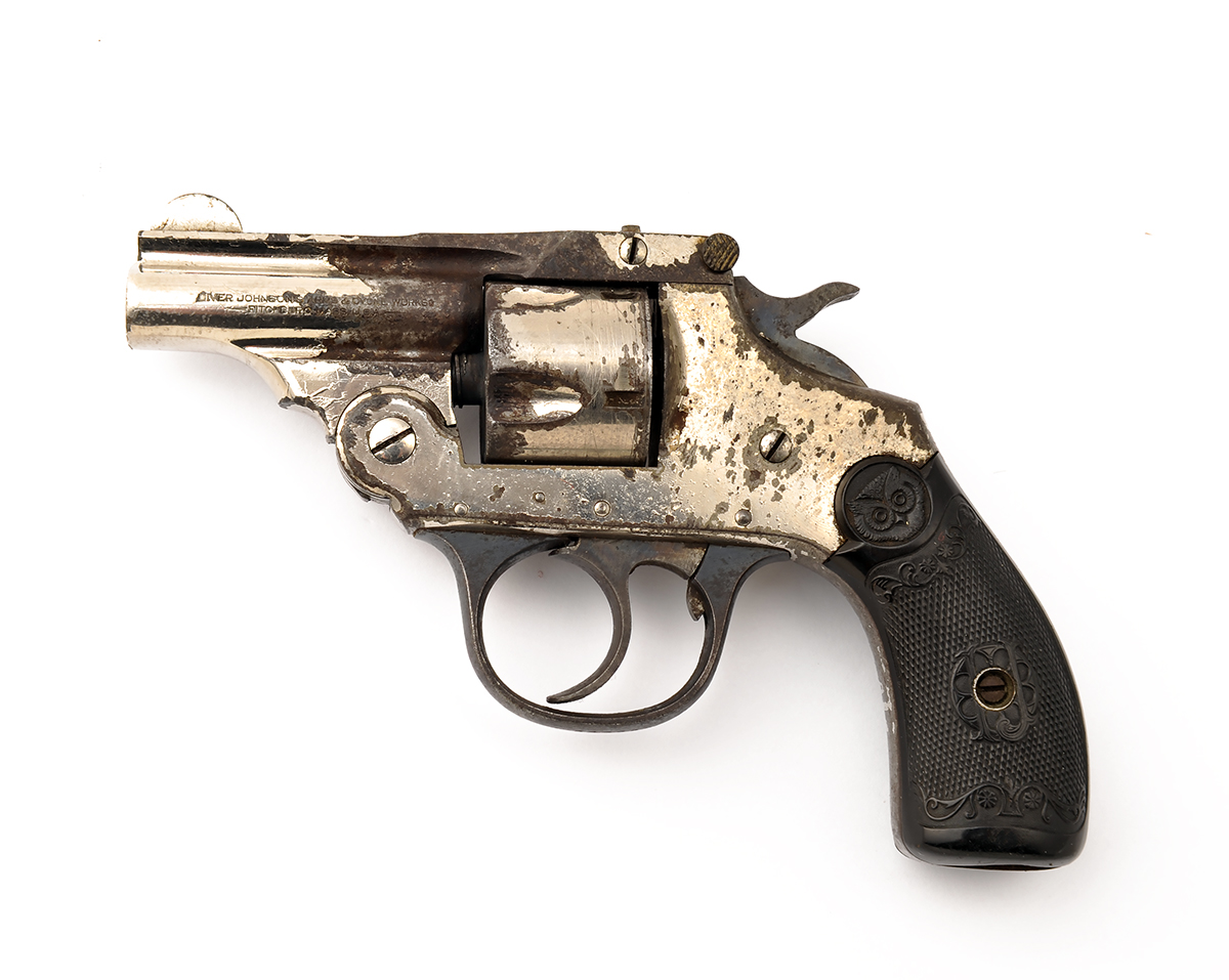 A .32 (S&W) POCKET-REVOLVER SIGNED IVER JOHNSON, serial no. 54328, with 2in. barrel, break-open frame, fluted cylinder and chequered black plastic grips, retaining strong traces of its original nickel-plated finish