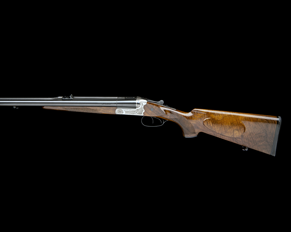 23 1/2in. nitro barrels with stepped raised solid matt rib, open sights with two folding leaf sights, ramped bead fore-sight, scroll-back treble-grip action with side-bolsters, removable striker discs, manual safety, Germanic scroll engraving, bright and blued finish overall, 15in. pistolgrip stock including 1/2in. rubber recoil pad, with cheekpiece, pistolgrip-cap and sling swivels, weight 11lb.