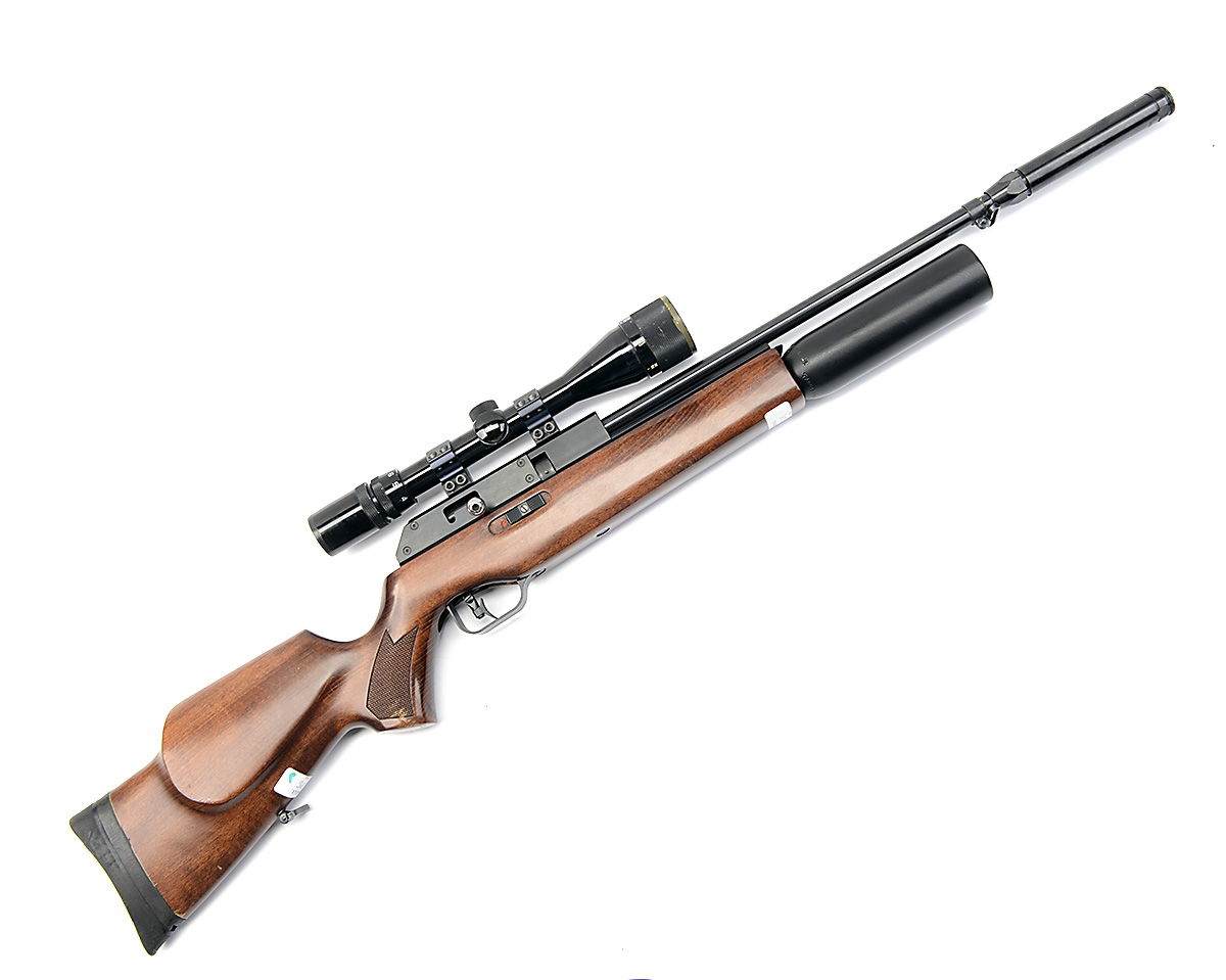 A .22 PRE-CHARGED PNEUMATIC AIR-RIFLE SIGNED BSA, MODEL 'SUPERTEN, serial no. DP06457, with floating 22in. barrel including attached sound moderator, alloy receiver with detachable magazine and beech half-stock, untested, fitted with a Nikko Sterling 4-12x40 telescopic sight