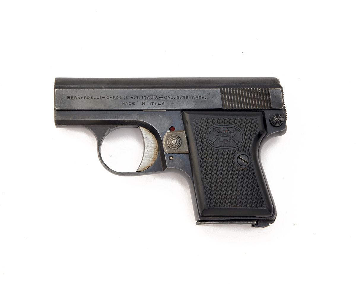 A .25 (ACP) SEMI-AUTOMATIC POCKET-PISTOL SIGNED 'BERNARDELLI', serial no. 47466 dated 1951, with 2in. barrel with sighting grove marked 'BERNADELLI-GARDONE V. T. ITALIA-CAL. 6.35 BREV. / MADE IN ITALY ', blued slide and frame chequered black plastic grips marked 'JB'