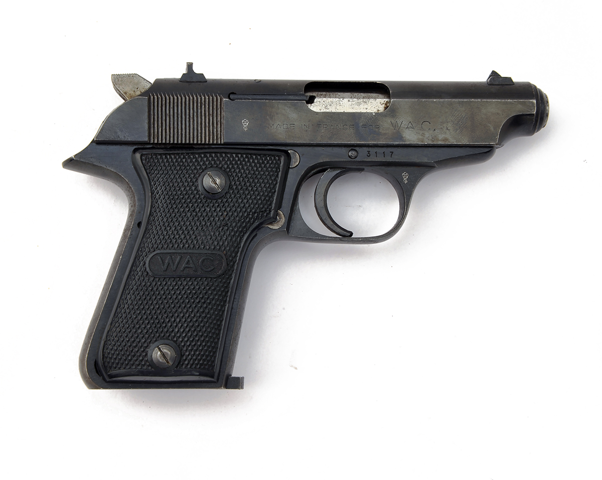 A .22 (L/R) SEMI-AUTOMATIC PISTOL SIGNED MAB, MODEL 'G', serial no. 3117, with 3 1/8in. barrel, dove-tailed fore-sight, blued closed slide, blued frame and chequered black plastic grips