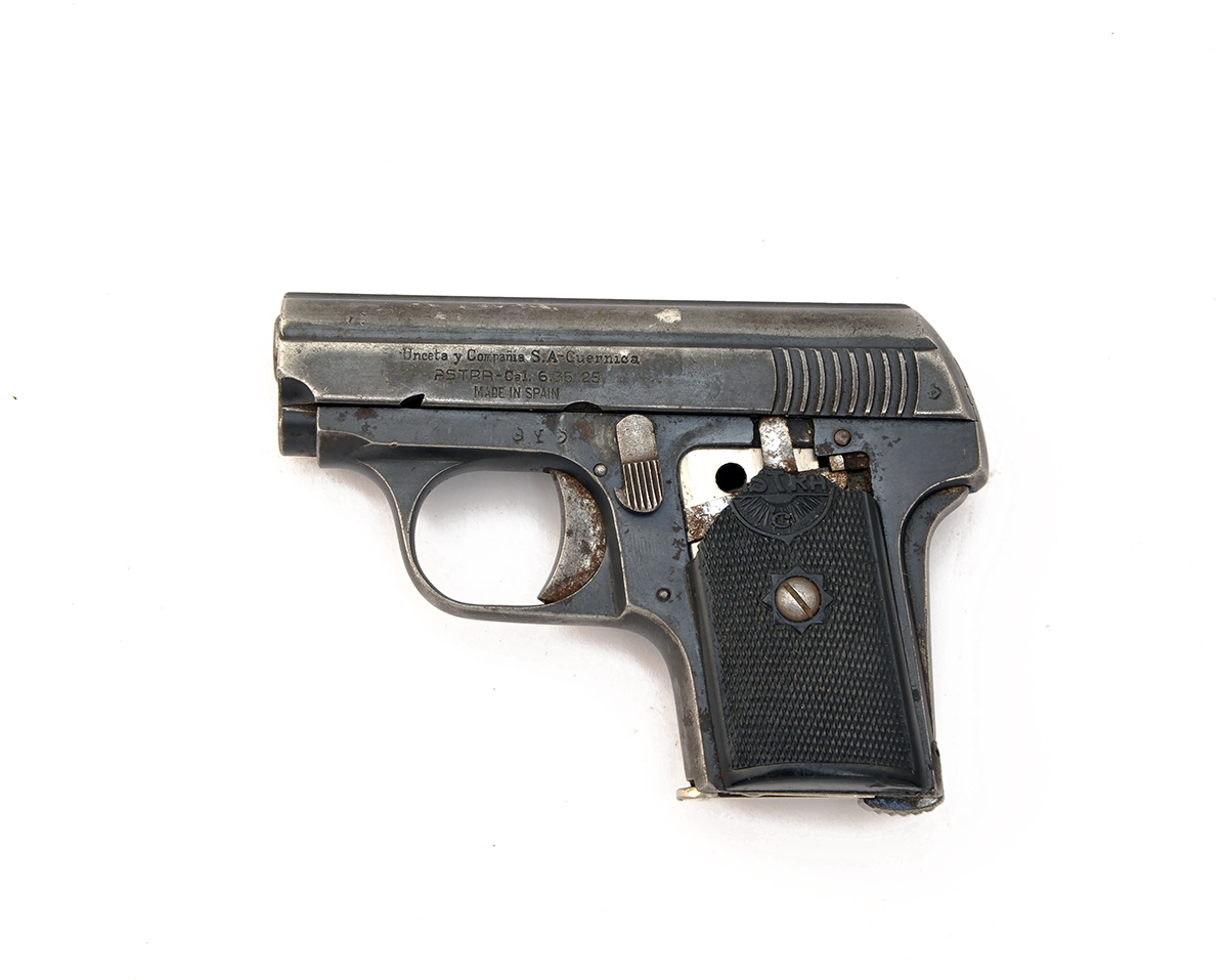 A .25 (ACP) SEMI-AUTOMATIC POCKET-PISTOL SIGNED 'ASTRA', serial no. 703551, with 2in. barrel with sighting grove, marked 'Unceta y Compania S,A-Guernica / ASTRA-Cal. 6.35 .25 / MADE IN SPAIN', blued slide and frame, damaged chequered black plastic grips marked 'ASTRA'