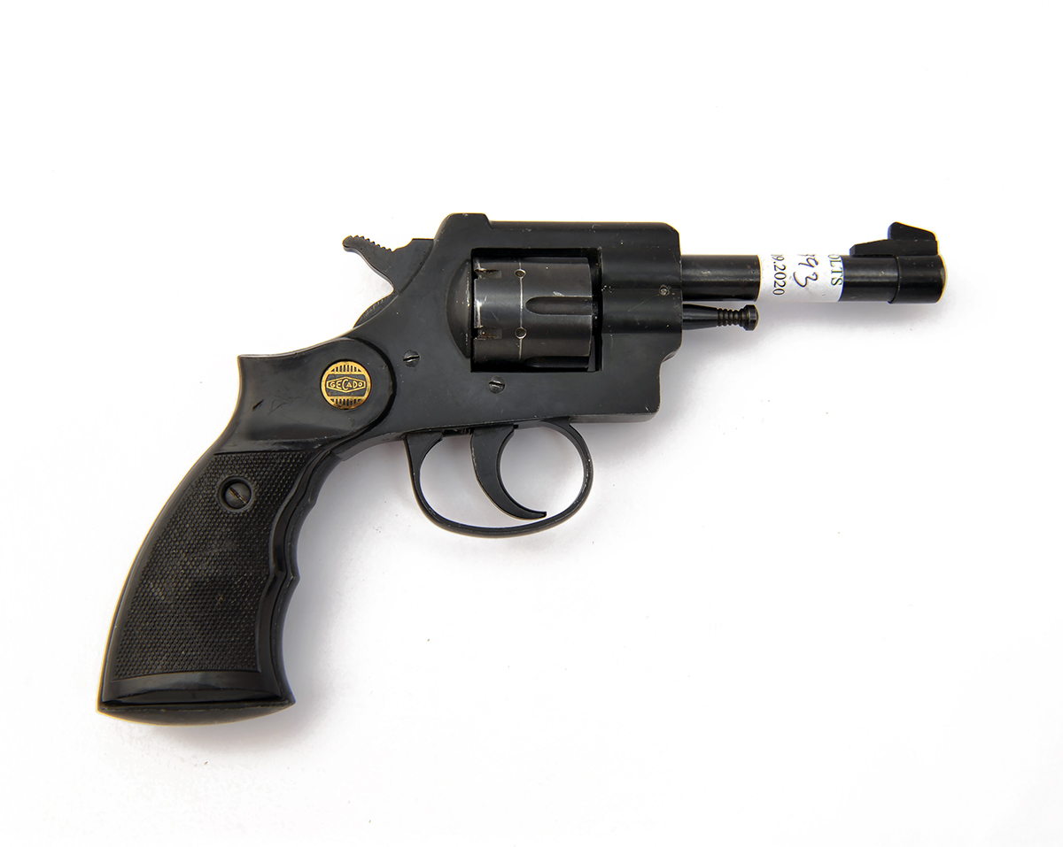 A .22 (L/R) SIX-SHOT REVOLVER SIGNED GECADO, serial no. 10986, with blued 3 5/8in. barrel, solid alloy frame, swing-out fluted cylinder and chequered plastic grips,