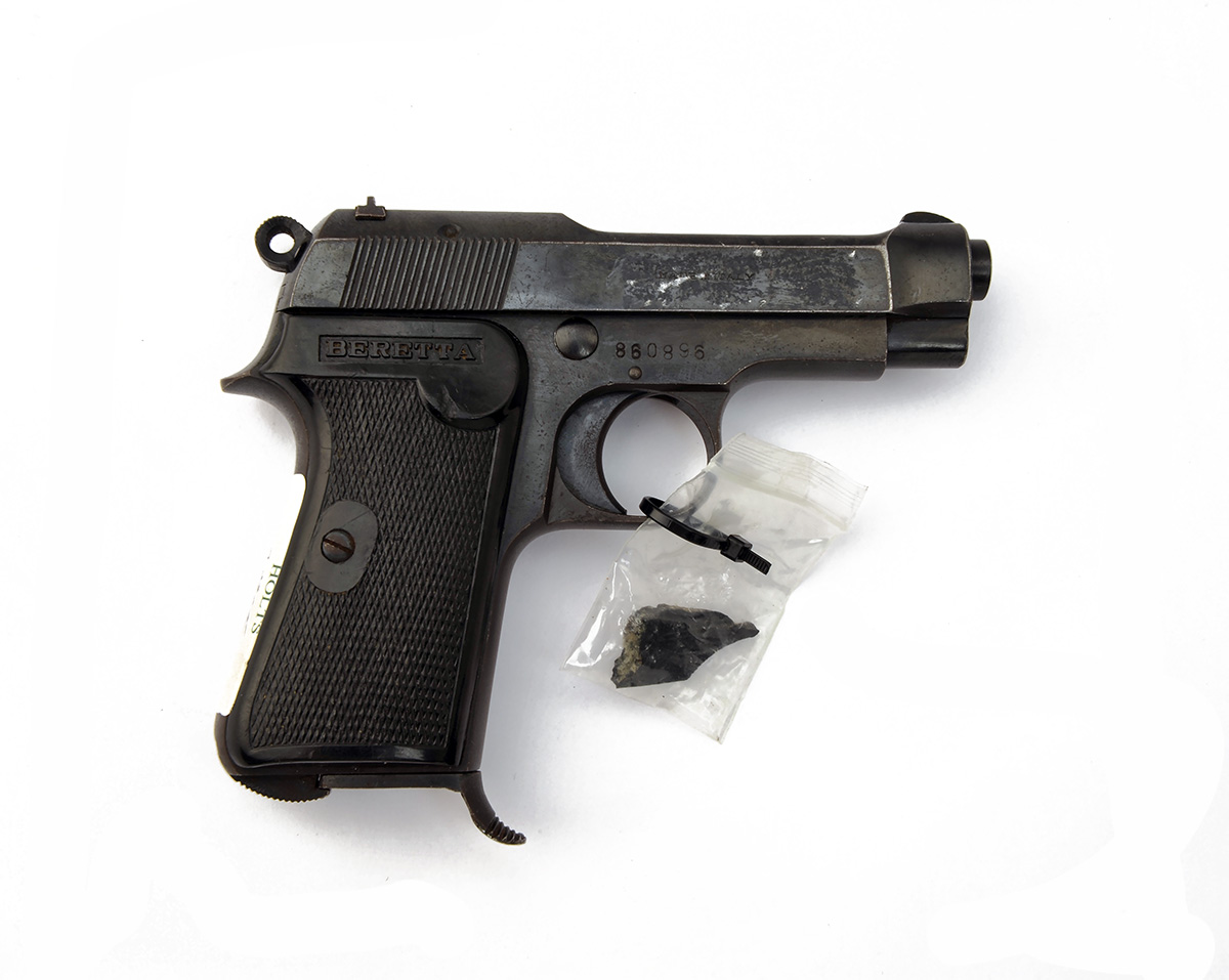 A .32 (ACP) SEMI-AUTOMATIC PISTOL SIGNED BERETTA, MODEL 'PUMA', serial no. 860896, with exposed blued 3 1/4in. barrel, open slide, blued frame and chequered black plastic grips (left broken but piece present)