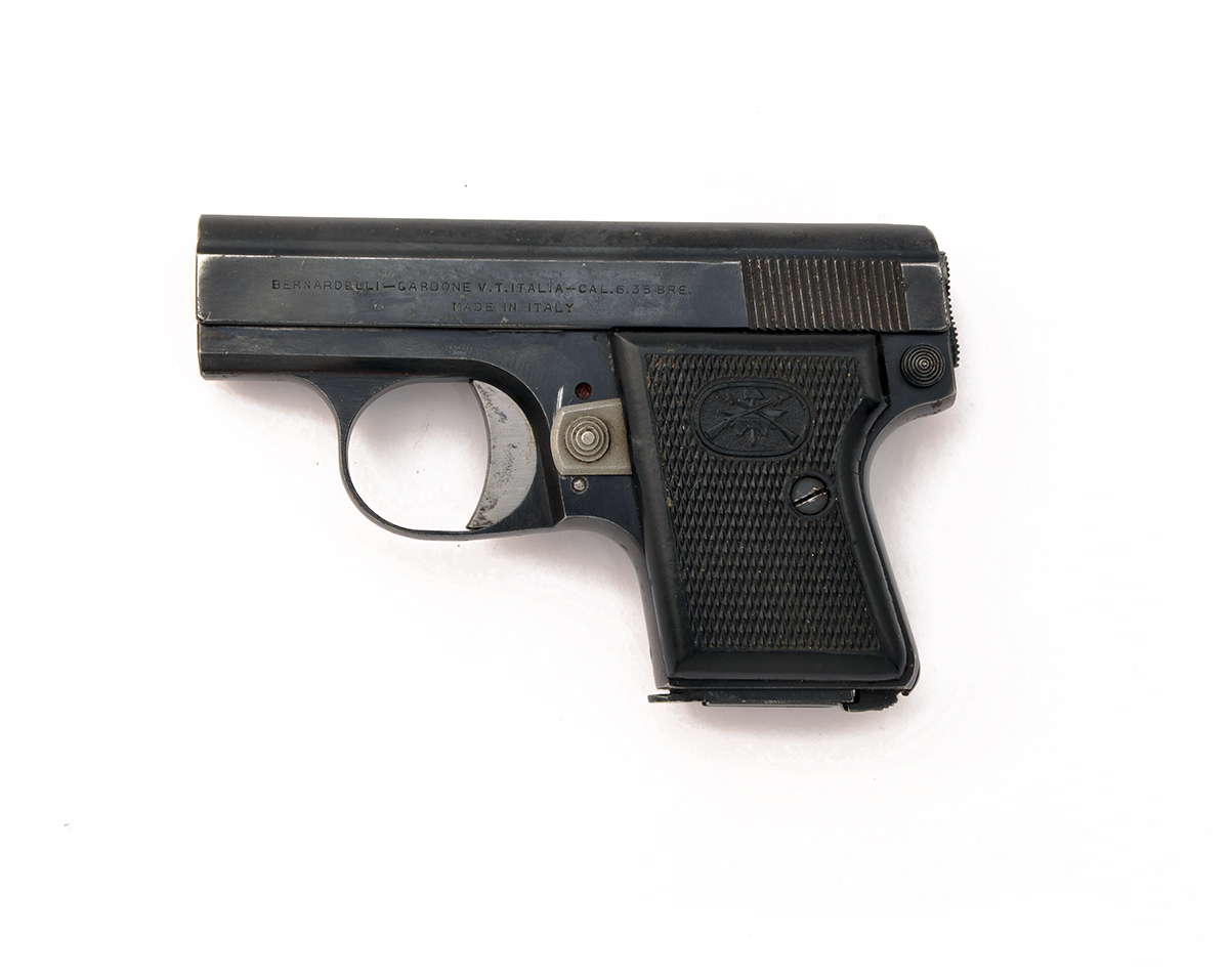 A .25 (ACP) SEMI-AUTOMATIC POCKET-PISTOL SIGNED 'BERNARDELLI', serial no. 54764 dated 1952, with 2in. barrel with sighting grove marked 'BERNADELLI-GARDONE V. T. ITALIA-CAL. 6.35 BRE. / MADE IN ITALY ', blued slide and frame chequered black plastic grips marked 'JB'