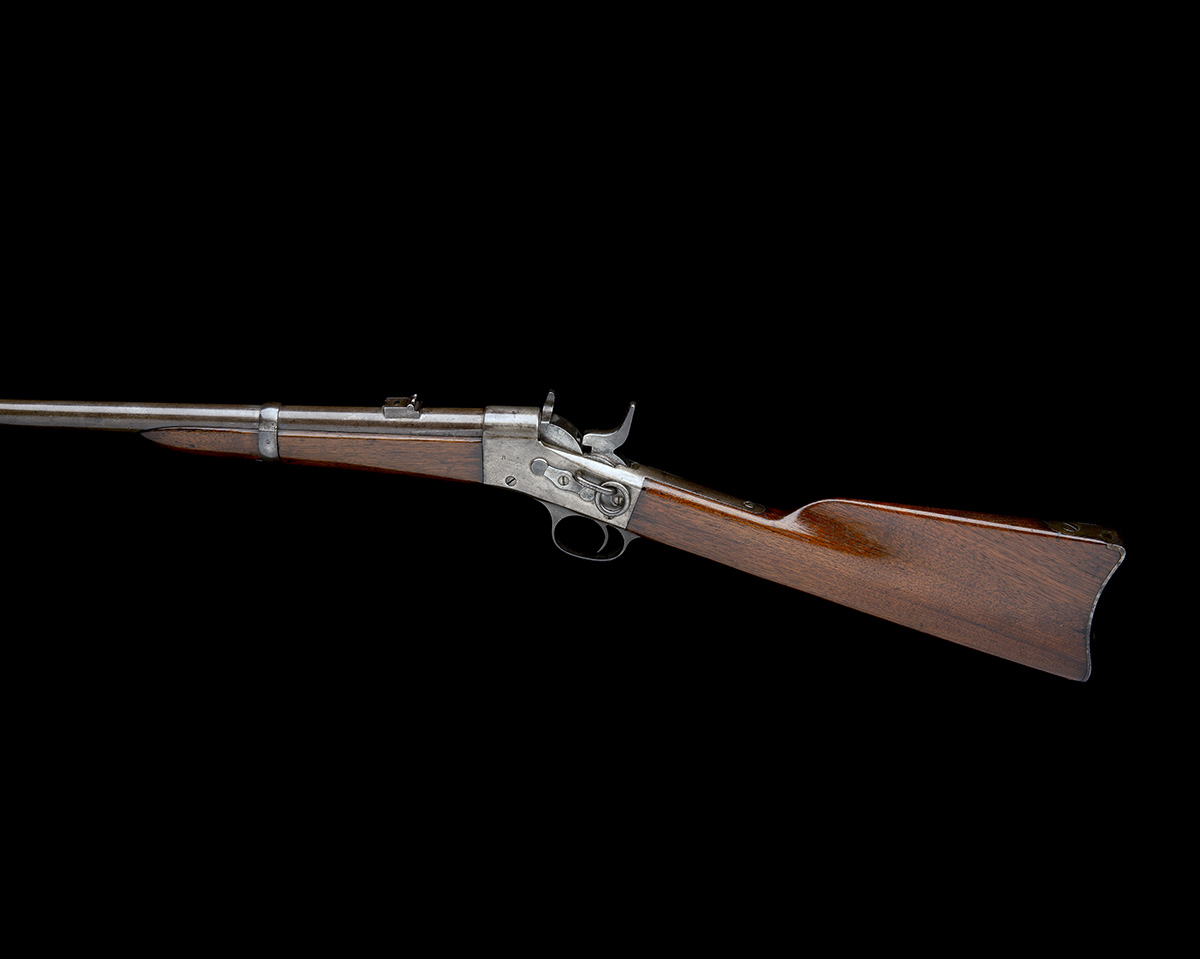 circa 1885, with tapering round 20 1/2in. barrel (stained to light brown), pinched blade fore-sight, twin blade folding rear-sight, plain action with traces of colour, three line address and patent details to top-tang, walnut butt-stock, iron heel-plate of carbine style and single barrel band to the walnut splinter fore-end