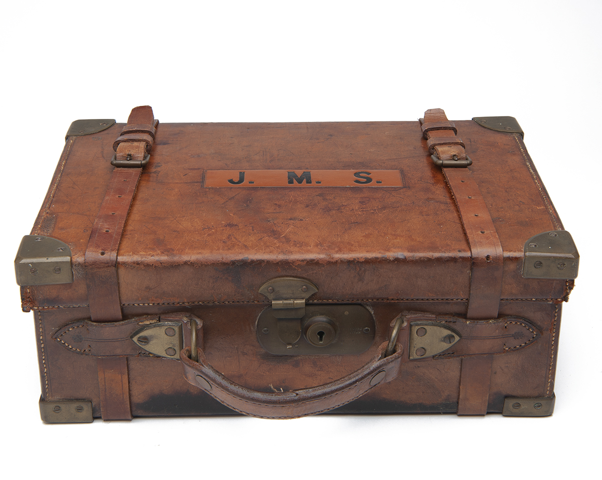 A BRASS-CORNERED LEATHER CARTRIDGE MAGAZINE,