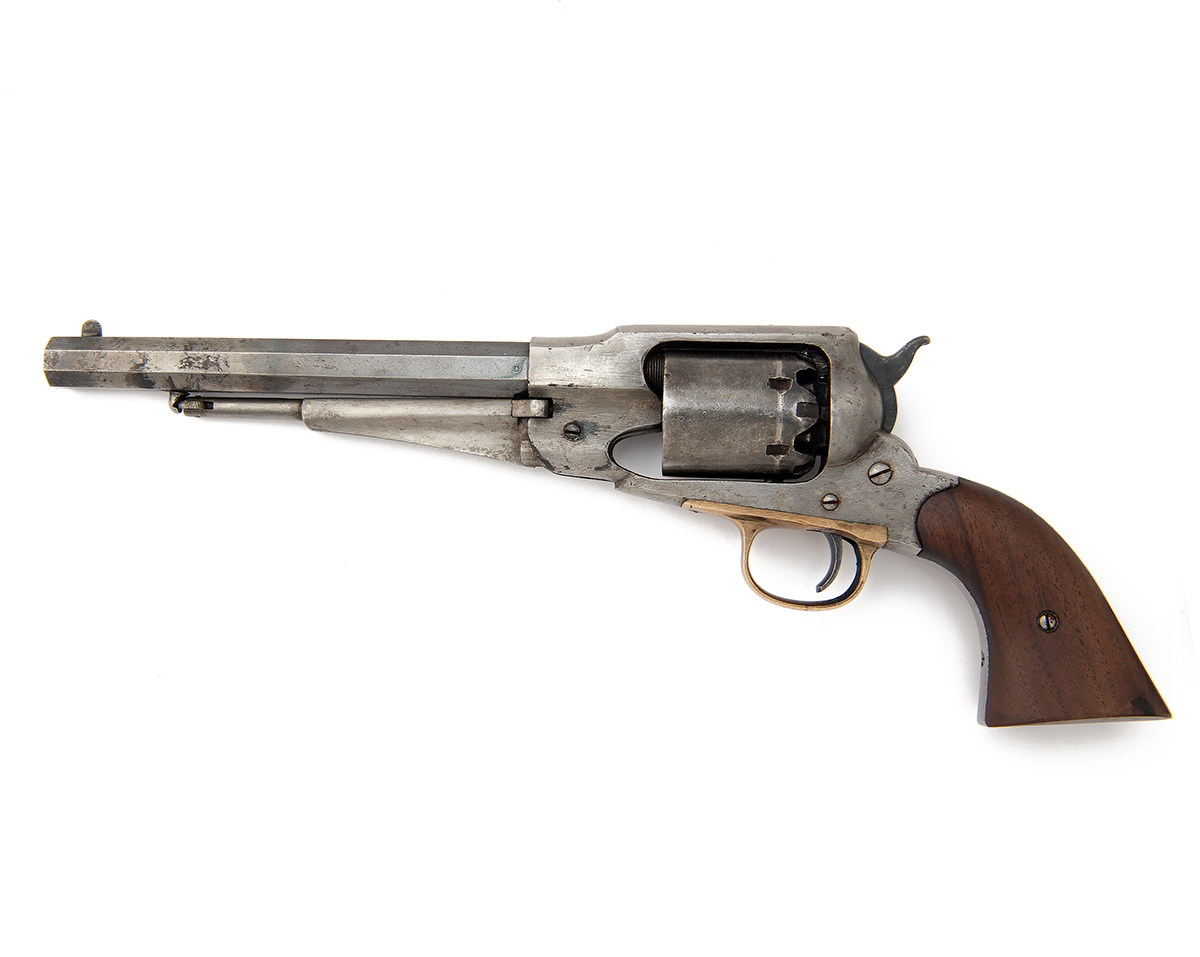 circa 1867, with blued 8in. octagonal barrel signed on the top-flat in three lines 'PATENTED SEPT 14 1858, E. REMINGTON & SONS, ILION, NEWYORK, U.S.A., NEW MODEL', pinched blade fore-sight, solid iron frame with full-length sighting groove to the top-strap (stripped of finish), plain cylinder, brass trigger-guard and smooth walnut grips (possible replacements)