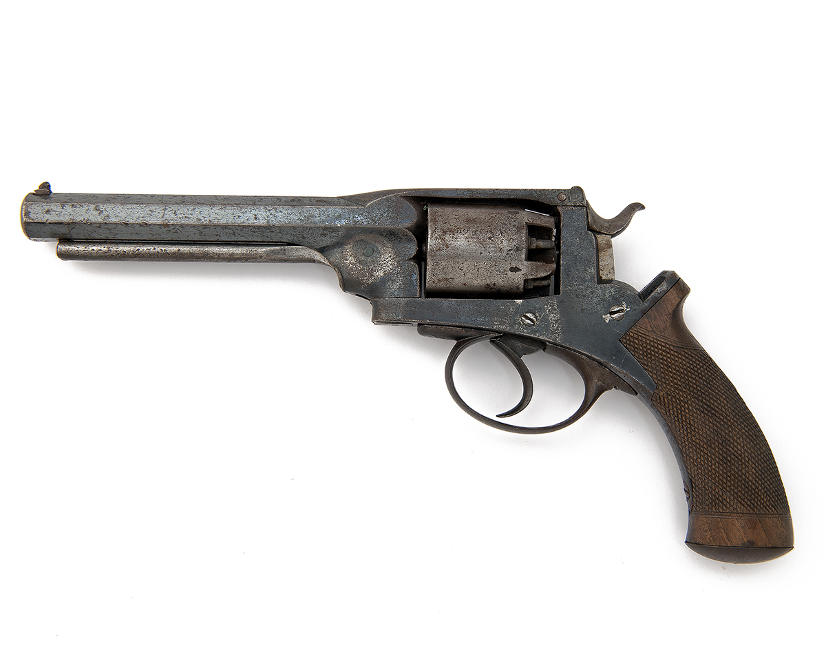 circa 1857, with blued octagonal 6in. barrel, dove-tailed blade fore-sight, standing notch to rear of top-strap, the top-strap signed 'DEANE & SON, 30 KING WILLIAM STREET, LONDON BRIDGE', plain cylinder, two-piece frame with swinging safe mounted to the right hand side of the recoil shield, chequered semi sawhandled walnut grip and double action mechanism (at fault), strong amount of finish remaining with some areas of bruising