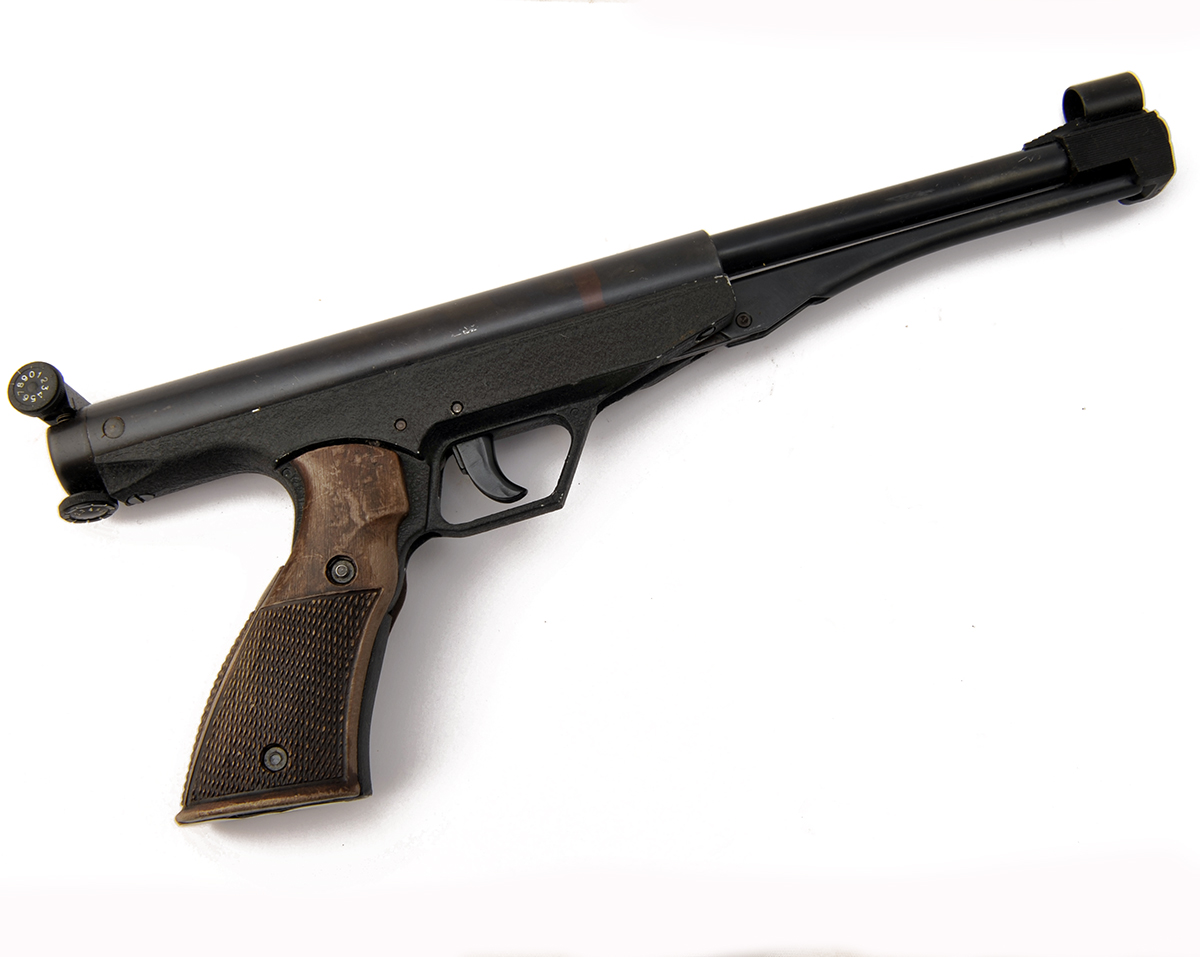with blued 7 1/4in. barrel, side loading gate, air-chamber with telescopic sight rails, black crackle finished receiver and right hand plastic grip