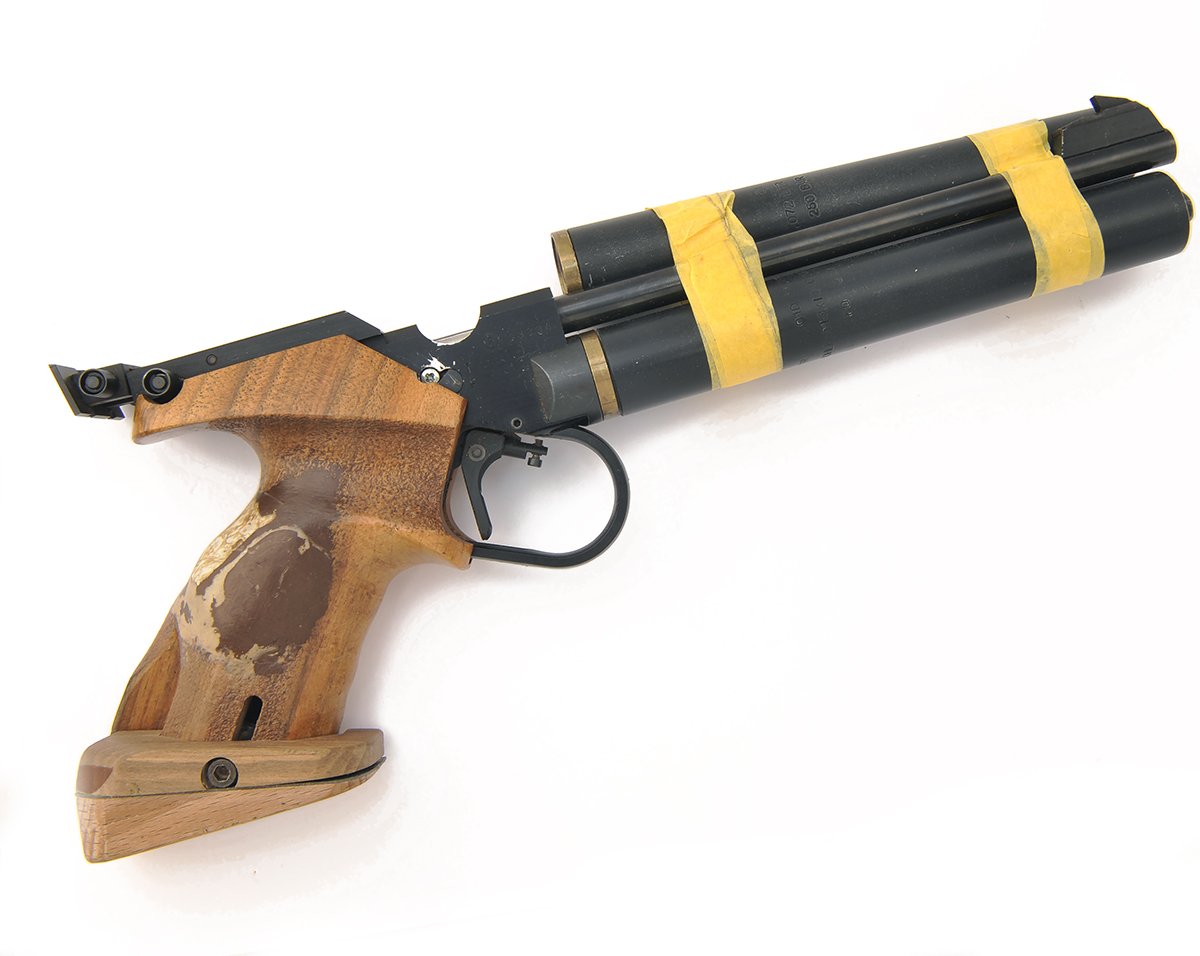 with match-sighted 8 3/4in. barrel, alloy receiver, walnut right hand grip and under-barrel reservoir (spare included), untested