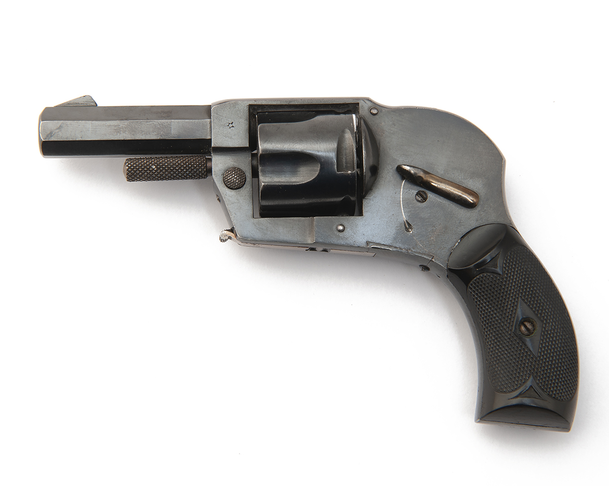 of velo-dog style circa 1885, with blued octagonal 2 3/8in. barrel, blade fore-sight, solid elongated blued frame with sighting groove to the top-strap and internal hammer, straw-finished side safe, fluted cylinder, side loading gate, folding trigger and pull-out ejector, fitted with chequered hard rubber grips, appearing little used and retaining virtually all its original finish