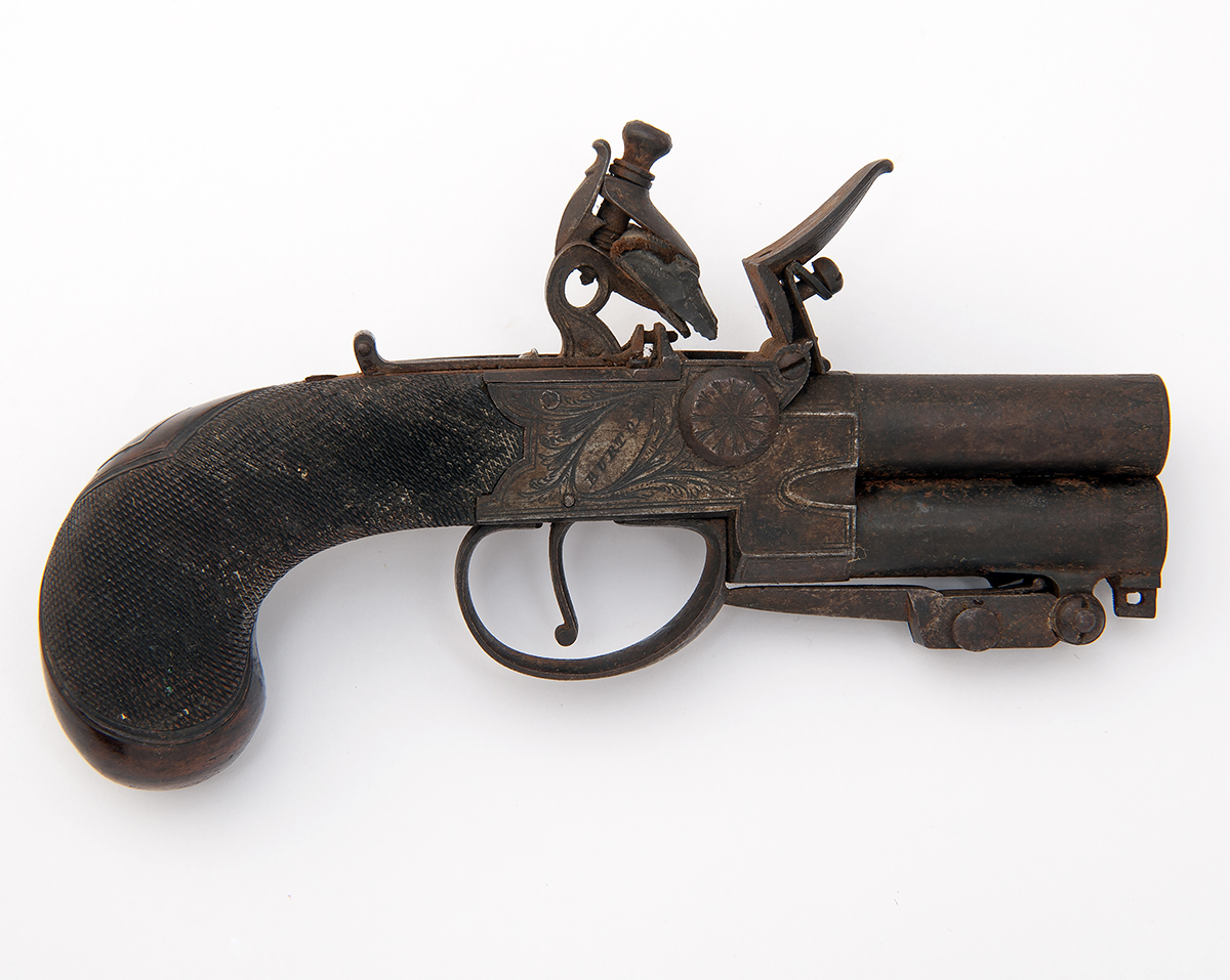 A 60-BORE FLINTLOCK OVER-UNDER TAP-ACTION BOXLOCK POCKET-PISTOL WITH SPRUNG BAYONET,