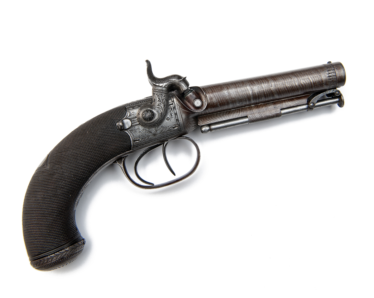 circa 1835, with browned damascus 4in. side by side barrels, engraved lines and bands at muzzle, bead fore-sight, the concave top-rib signed 'W. PARKER, HOLBORN, LONDON', acanthus engraved top-strap with carved sighting groove extending the rib, radiused acanthus and border engraved boxlock action with engraved dolphin-headed hammers, sliding safes to rear, finely chequered walnut grip with clipped corner rectangular escutcheon at wrist, engraved domed iron pommel-cap with push-button release for the spring loaded concealed trapdoor, twin guarded triggers, fully engraved trigger guard bow and captive iron ramrod with damascus under-rib, complete in its maker's fitted walnut case lined and compartmented in dark blue velvet, small parchment Parker trade label to the inside of the padded lid and including period accessories such as a bone handled brush, a mahogany loading and cleaning rod, a scissors ball-mould, a red morocco leather container for spare nipples (empty), a nipple key and a three-way flask, external hook and lock closure (wood repaired around lock, key absent)