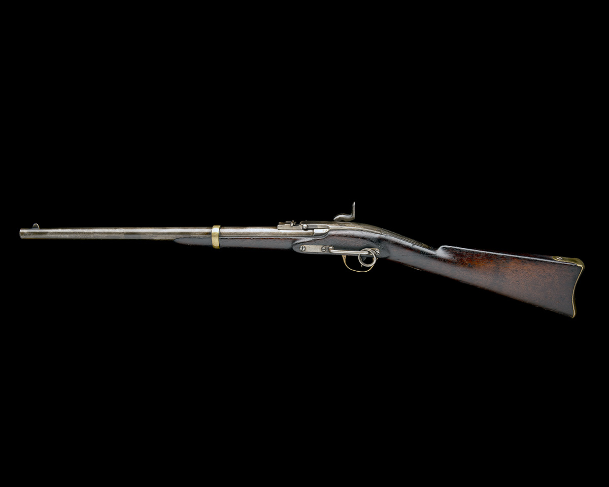 circa 1862, with tapering round 22in. barrel, applied fore-sight blade, double folding leaf rear-sight, rearward hinged lift-up breech-lever signed 'J.H. MERRILL, BALTO, PAT. JULY 1858', plain bevel-edged lock signed 'J.H. MERRILL BALTO. PAT. JULY 1858 APL. 9 MAY 21-28-61', walnut half-stock with brass patch-box inlet to the right hand side of butt, brass crescent heel-plate, brass trigger-guard bow and tang, iron saddle-bar and ring and splinter fore-end with single brass barrel-band