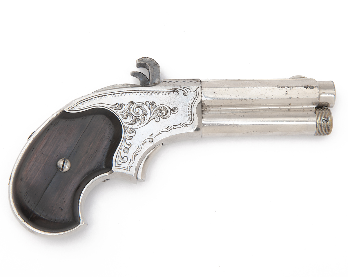 no visible serial number, manufactured between 1871 & 1888, with octagonal 3in. barrel, rounded muzzle, the top-flat signed 'E. REMINGTON & SONS ILION' over 'RIDER'S PAT. AUG 15th 1871', scroll engraved receiver, twin cocking and loading hammers, smooth wood birdshead slab-sided grips (right cracked and repaired) and under-barrel tubular magazine, the whole retaining virtually all its original plated finish