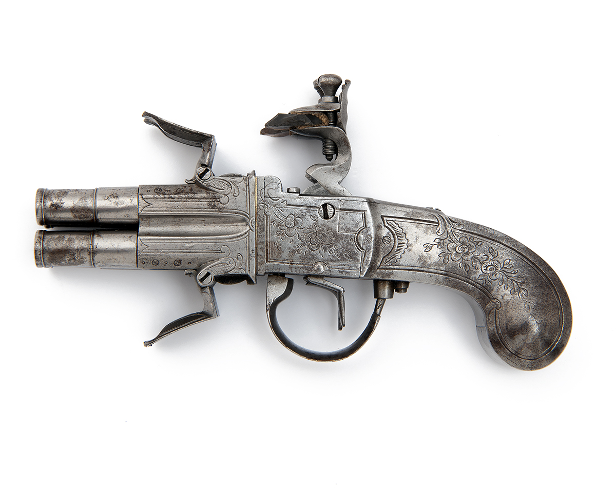 no visible serial number, circa 1780 and almost certainly of Belgian manufacture, with 1 1/4in. tapering banded cannon-muzzled barrels falsely rifled at the muzzles (one frozen), borderline engraved fluted breech-section with four individual pans, brass washer plate, borderline and florally engraved squared boxlock action with twin central cocks, separate top-plate joining to the integral engraved steel slab-sided butt with slight swelling at the pommel, guarded twin triggers, the trigger guard bow depressing to release the barrels for turning, brushed bright finish throughout
