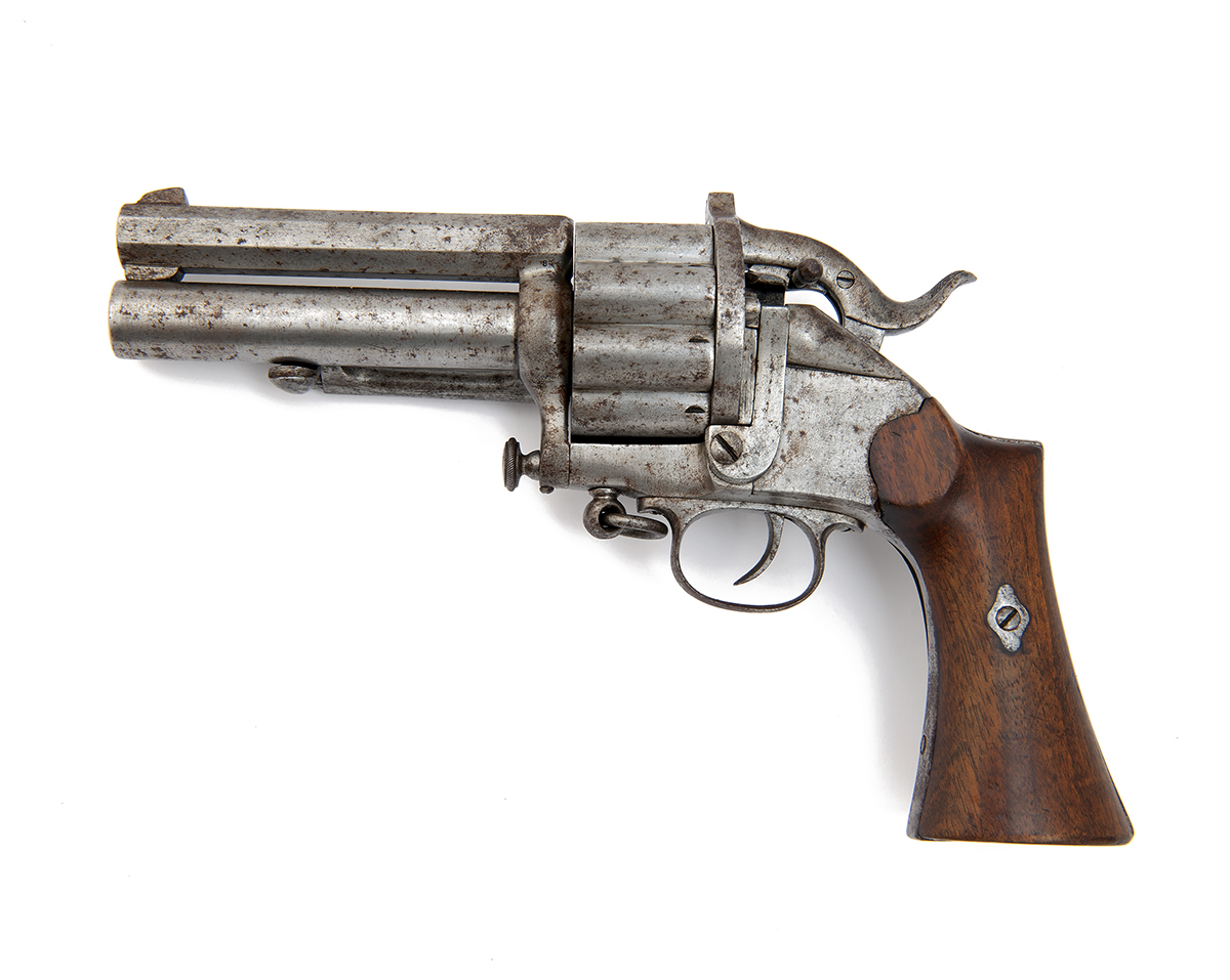 circa 1870, with octagonal 4 1/2in. 10mm barrel, the top-flat marked 'COLONEL LE MAT PATENT', blade fore-sight, standing notch rear-sight to top of standing breech, underslung smooth-bore .577 barrel, nine-shot fully fluted cylinder, open iron frame with side loading gate for the cylinder and central loading gate with firing pin for the central barrel, large spurred hammer with selectable nose, smooth flared walnut grip, side mounted ejector, guarded single action trigger, lanyard ring and take down nut to front of frame, in the white finish with some mild staining
