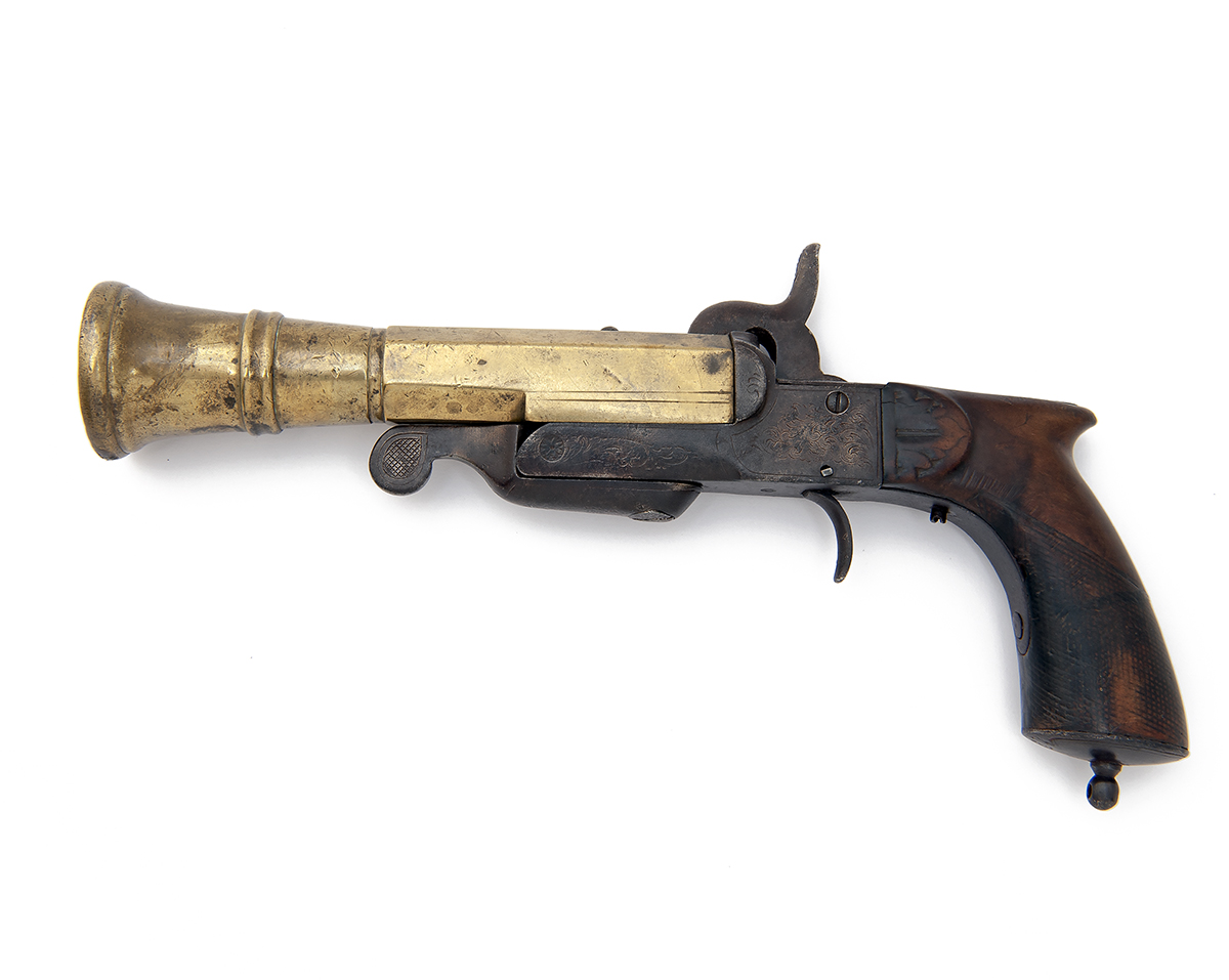 circa 1880, with octagonal to round brass 6 3/4in. barrel strongly flaring at the muzzle and with three bands, the top-flat with remains of a screwed fixing (possibly a rear-sight or belt hook), scroll engraved open iron frame with off-set central hammer, walnut saw-handled butt with traces of chequering and carving carving at head (losses), trigger guard bow missing and Lefaucheux forward facing swing under-lever, worn, detail rubbed