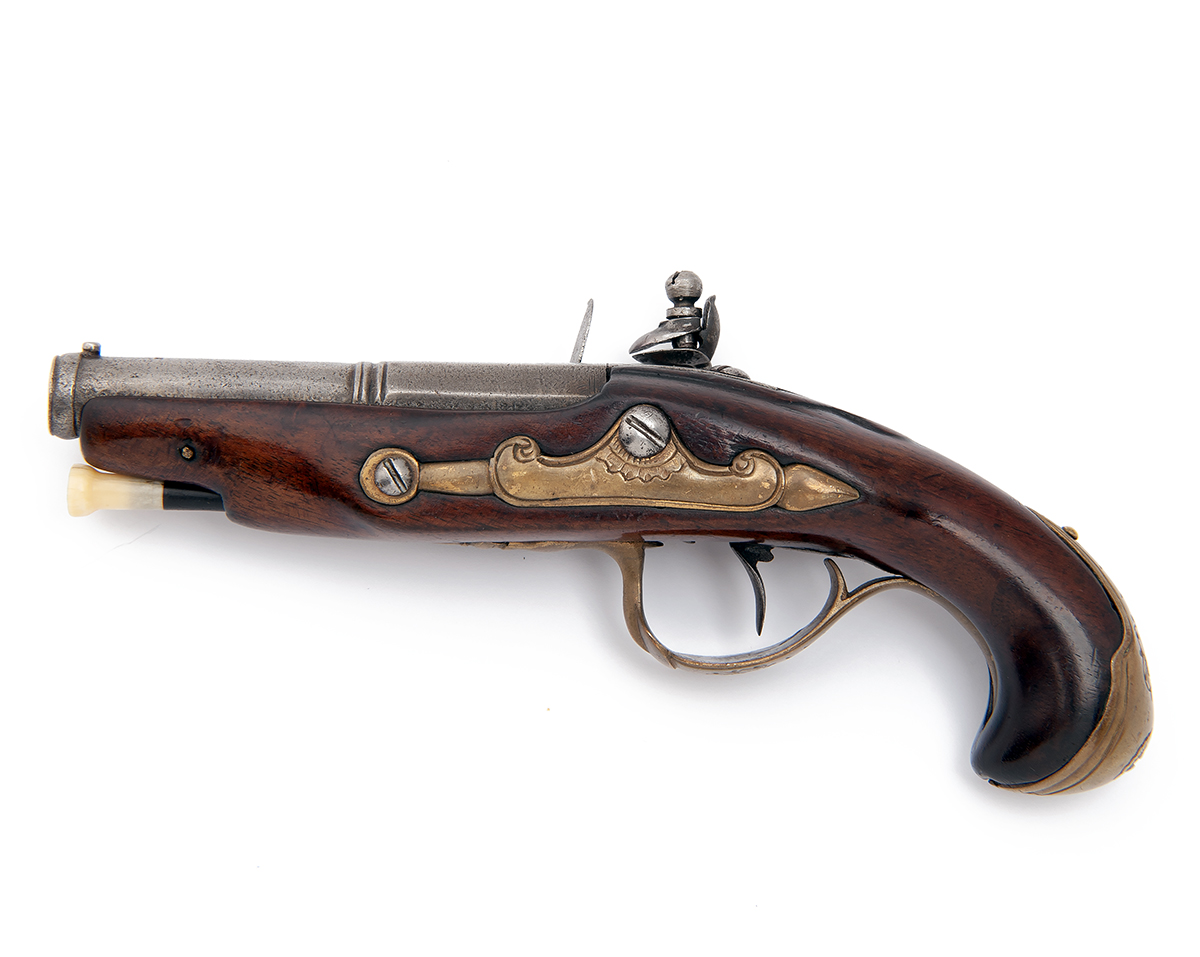 French or Belgian circa 1775, with 3 5/8in. iron barrel of Spanish form, cannon muzzle, bead fore-sight, solid top-tang, radiused small size lock with swan-necked cock (repaired, screw replaced) and brass pan, walnut full-stock with brass furniture and replacement horn-tipped ramrod