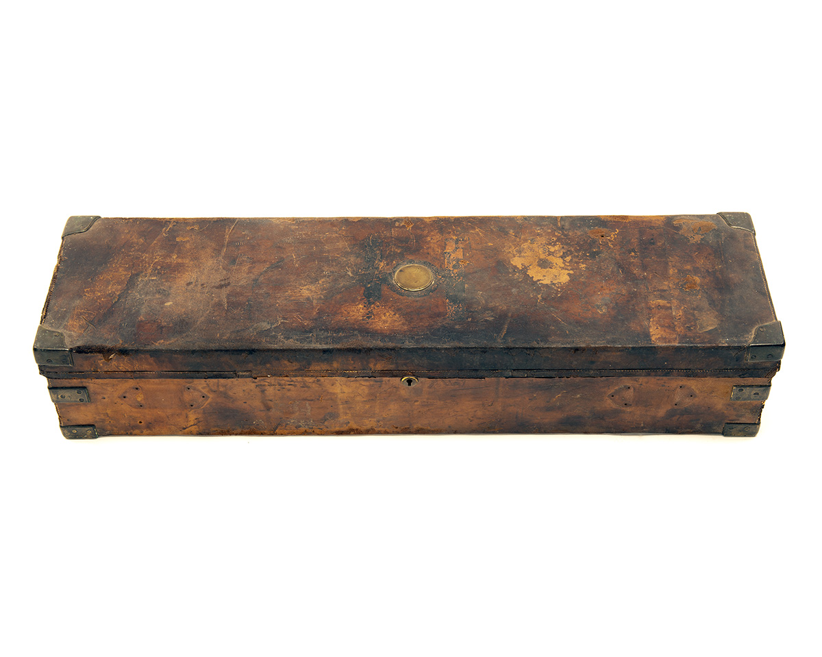 fitted for 30in. barrels, the interior lined with red baize, a J. Purdey trade label, made for gun serial numbers 8308/9 in 1870 with confirmation letter from James Purdey & Sons, brass lock (key missing), handle missing
