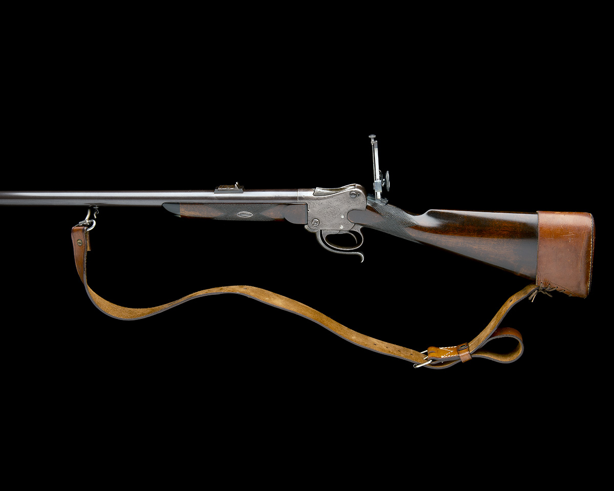 circa 1873, with heavy round 33in. replacement barrel (numbered 1014), dove-tailed tunnel fore-sight, standing notch rear-sight with two additional folding leaves, scroll engraved action with dropping feed-ramp and long side-safe, a later 'Dr Godwin' produced micro-adjustable peep-sight fitted at wrist, chequered walnut straight hand butt-stock, engraved under-lever formed around the front of the trigger guard bow and chequered walnut fore-end with rounded horn tip, fitted with a leather sling
