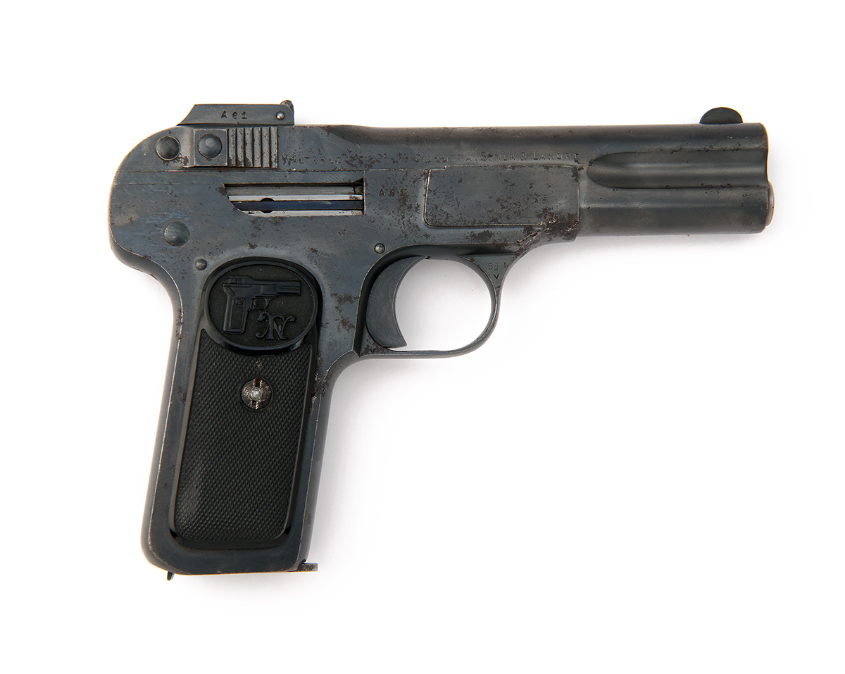 circa 1900, with under-slung 4in. barrel, top-mounted recoil-spring, blued machined and moulded slide marked by the retailer 'WALTER LOCKE & CO. LTD, CALCUTTA, SIMLA & LAHORE', cocking indicator within the rear-sight, blued frame, chequered hard rubber grips with early 'pistol' trademark to top and guarded trigger, much original finish remaining