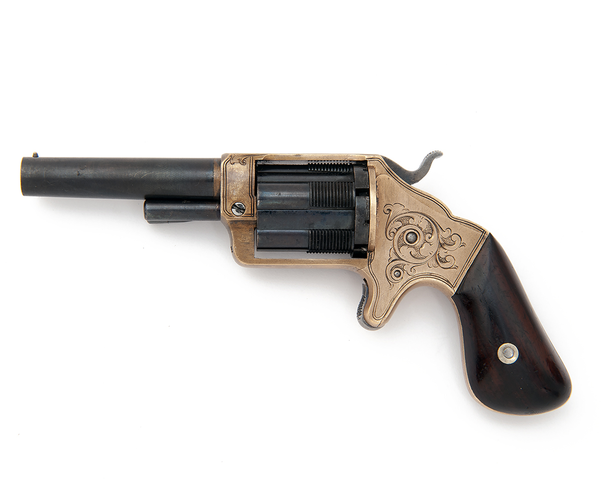circa 1864, with expertly reblued round 3in. barrel, the top with bead fore-sight and signed B.A. CO. PATENT APRIL 14TH 1863', borderline engraved brass frame with scroll engraving to the action sides (traces of silver plate), blued cylinder with separate sliding tube chambers, fixed ejector rod and semi bag-shaped walnut grips and spur trigger
