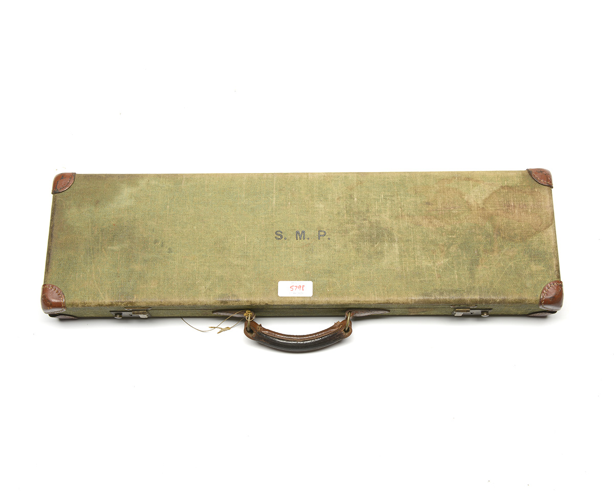 E.J. CHURCHILL 12-BORE 'FEATHERWEIGHT XXV' BOXLOCK EJECTOR, serial no. 5979, 25in. nitro reproved barrels, matt Churchill rib gold-inlaid 'XXV' at the breech end, the tubes engraved 'E.J. CHURCHILL (GUNMAKERS) LTD. ORANGE ST. GUNWORKS. LEICESTER SQUARE. LONDON.', 2 1/2in. chambers, bored approx. 1/4 choke in both, wall thicknesses at 18+ and 14, some external pits, automatic safety with gold-inlaid 'SAFE' detail, bold border and acanthus scroll engraving, the underside with a scrolling banner engraved 'FEATHERWEIGHT' and gold-inlaid 'XXV', the triggerguard gold-inlaid with a monogram 'PW', retaining traces of finish, 13 3/4in. figured stock, cast on for the left shoulder and including 1in. rubber recoil pad, diminutive fore-end, weight 5lb. 5oz., in its canvas and leather case