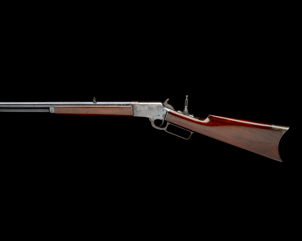 circa 1898, with blued round 24in. barrel signed by the maker, folding gold-washed ring fore-sight, standing notch rear-sight with two additional folding leaves, colour hardened receiver with field-strippable side-plate and blued bolt, the top-flat marked 'MARLIN SAFETY', folding peep-sight to tang marked 'patent', walnut butt-stock with iron crescent heel-plate, colour hardened finger-lever, walnut half fore-end and full-length blued under-barrel magazine tube, much original finish remaining