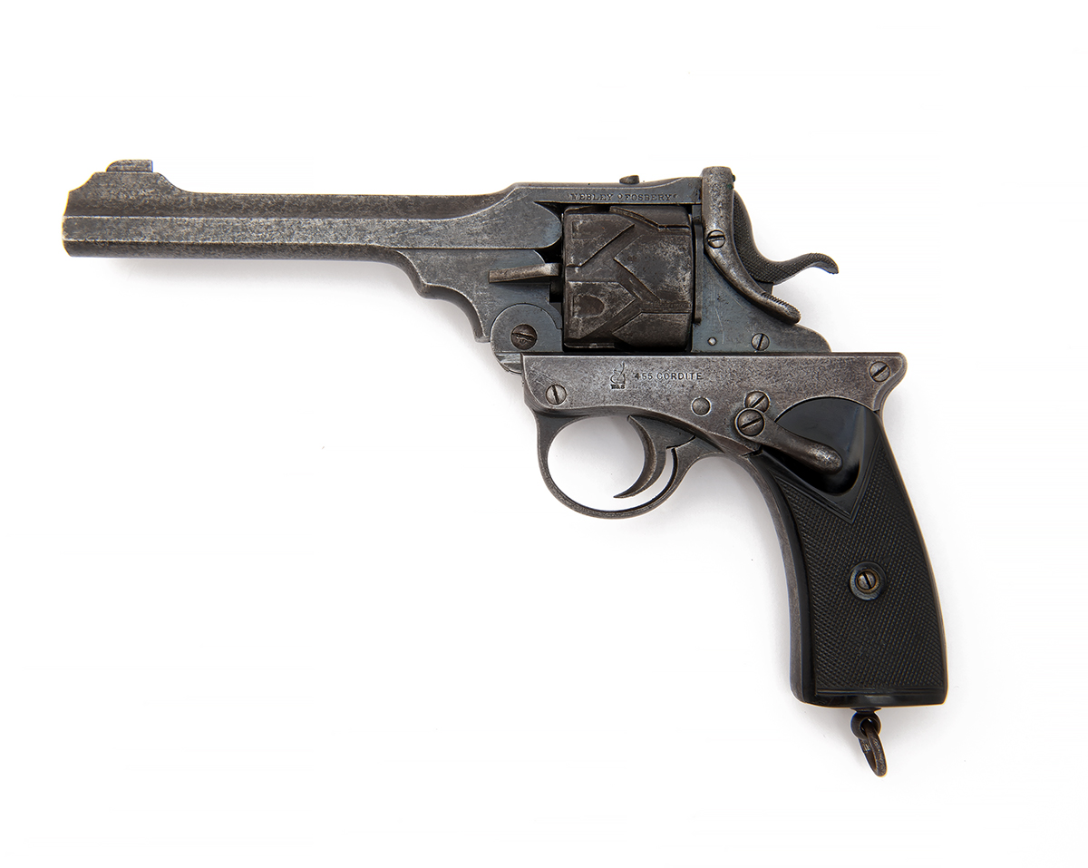 circa 1906, with 6in. sighted barrel, the top-rib signed 'P. WEBLEY & SON LONDON & BIRMINGHAM', the side of top-strap marked 'WEBLEY FOSBERY', left-hand of frame side marked with the 'Webley winged bullet logo and '.455 CORDITE', distinctive cylinder with 'zig-zag' indexing channels and front short blind shallow flutes, chequered sides to the hammer, black chequered hard rubber grips with lanyard ring to base, the whole with traces of original finish and complete with a period full-flap service holster (distressed)