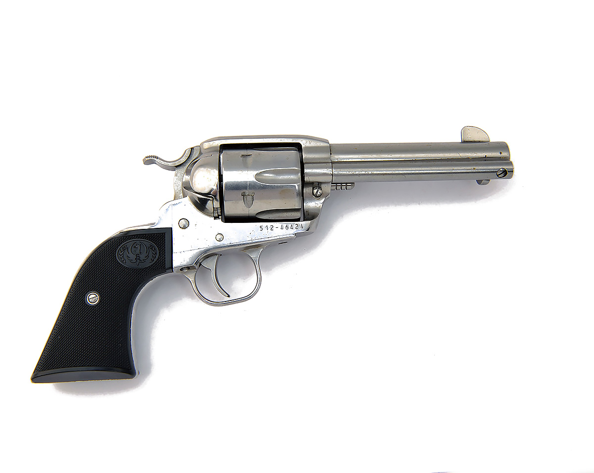 A BOXED .45 (L/C) SINGLE-ACTION STAINLESS REVOLVER SIGNED RUGER, MODEL 'VAQUERO', serial no. 512-464242, with 4 5/8in. barrel, solid frame currently fitted with a 'Bisley' style hammer (original included), fluted cylinder and chequered black plastic grips, in its maker's abs plastic carton