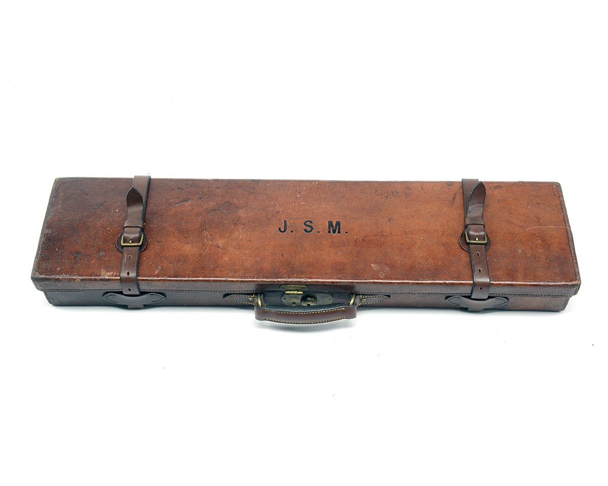 fitted for 30in. barrels, the interior lined with red baize, three-piece cleaning rod, G&J.W. Hawksley oil bottle, cleaning heads, brass lock (key missing), leather seem embossed with 'WESTLEY RICHARDS, BENNETTS HILL, BIRMINGHAM'