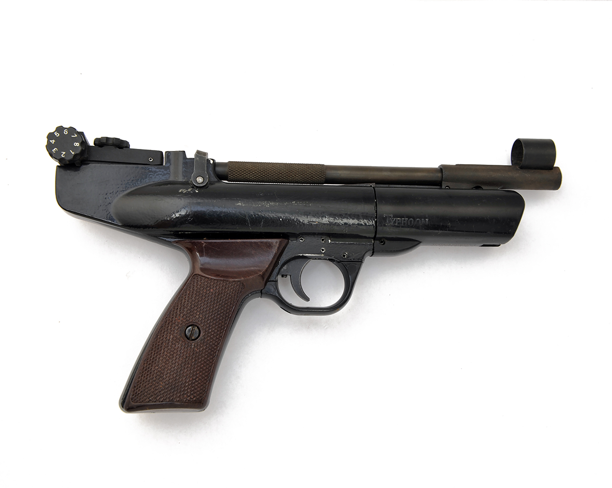A SCARCE .22 BARREL-COCKING AIR-PISTOL SIGNED WEBLEY & SCOTT, MODEL 'TYPHOON', no visible serial number, with 8in. sighted barrel, stove enamelled air-chamber and receiver, black plastic nose-cap, brown chequered plastic grip, detail worn