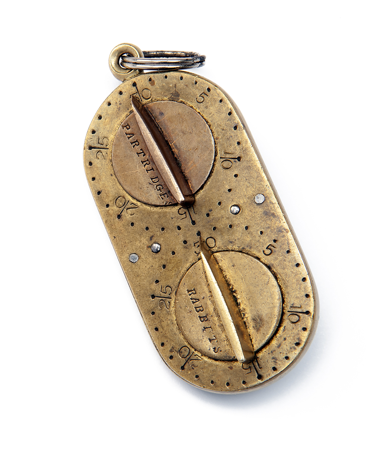 brass and nickel plate finish, four revolving counters engraved 'PHEASANTS, PARTRIDGES', 'RABBITS', 'HARES', signed 'G. & G.W HAWKSLEY', lanyard loop