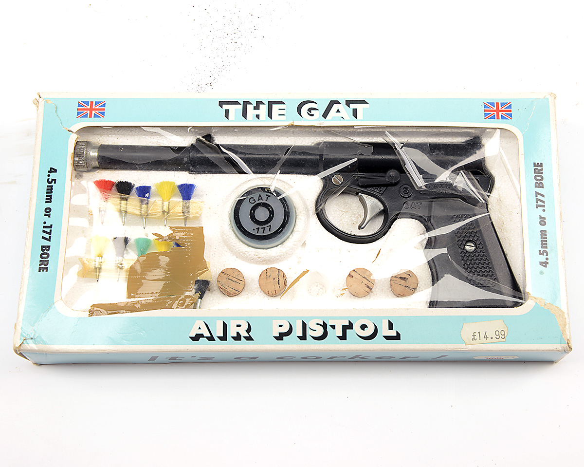 A BOXED .177 PLUNGE-COCKING SPRING PISTON AIR-PISTOL SIGNED 'T.J. HARRINGTON & SON, MODEL 'THE GAT', no visible serial number, circa 1990, with pop-out smoothbore barrel, black painted body with integral grip and side-safe, COMPLETE WITH its manufacturers display carton (cellophane window damaged) containing four corks (of five), twelve darts, and a tub of pellets, the whole appearing little used, with original price sticker of £14.99