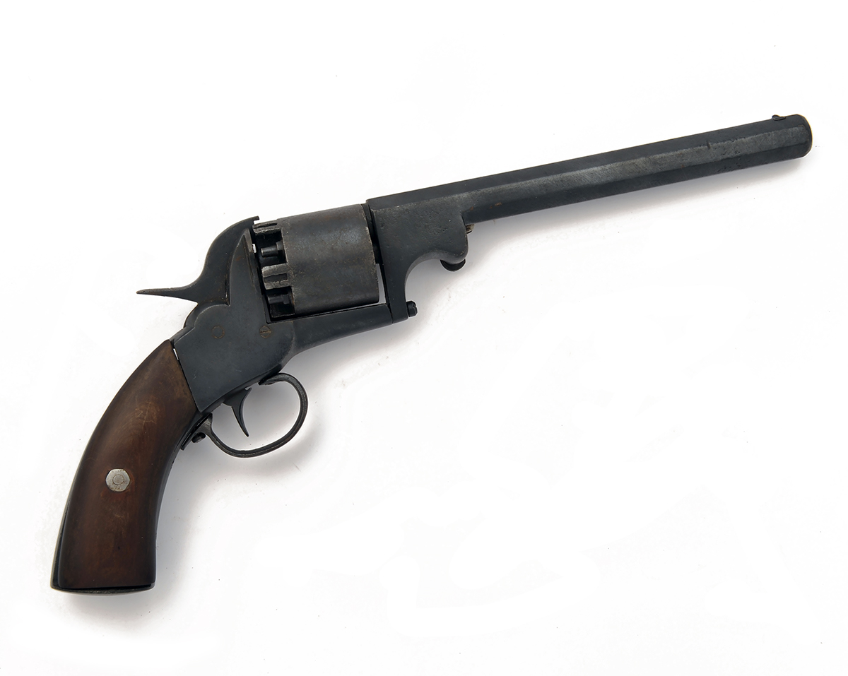 A 54-BORE PERCUSSION FIVE-SHOT REVOLVER, UNSIGNED, MODEL 'WEBLEY LONGSPUR', no visible serial number, circa 1851, with octagonal 7 3/8in. barrel, open iron frame, plain cylinder and smooth walnut grips, refinished with loss to detail