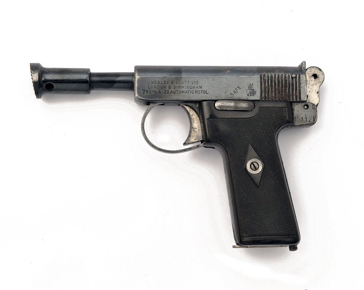 A .32 (ACP) SEMI-AUTOMATIC HUMANE KILLING PISTOL SIGNED WEBLEY & SCOTT, MODEL '1911 METROPOLITAN', serial no. 151121, adapted by another, with 4 3/8in. blued barrel including angled muzzle-break, blued slide and frame and chequered hard-rubber grips