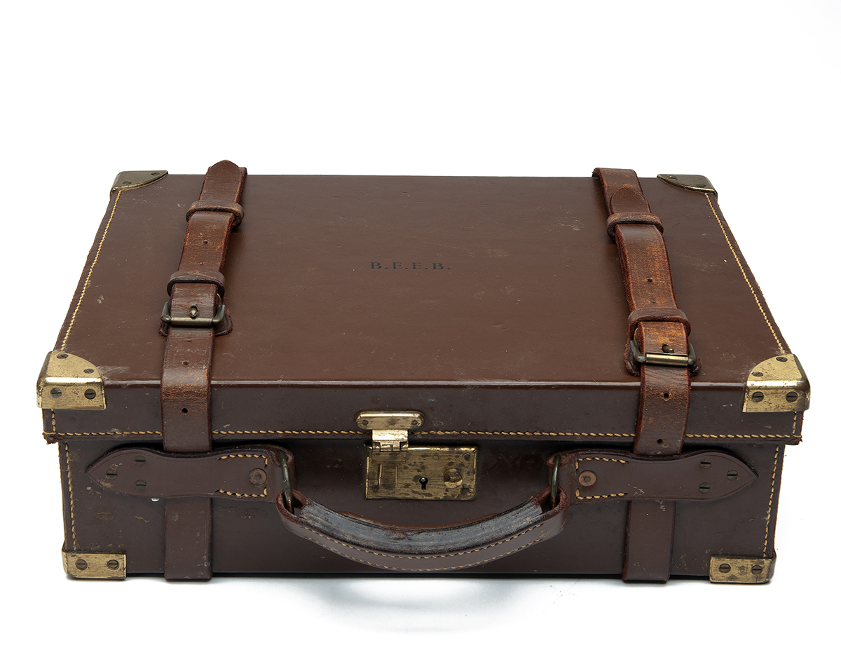 the interior lined with red baize and red leather, four removable dividers, five leather lifters, brass lock (key missing), the lid exterior with the monogram 'B.E.E.B.'