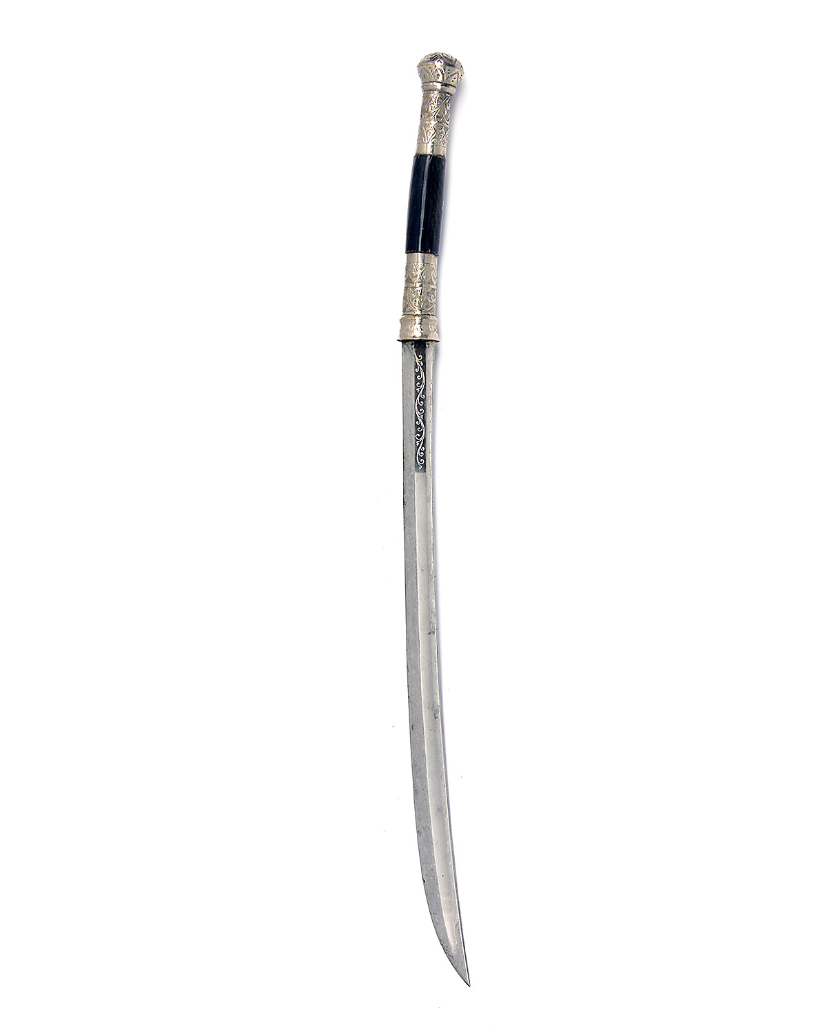 A WHITE-METAL MOUNTED BURMESE or THAI DHA, circa 1950's, with curving 23in. blade fullered for the full length, short panel of inlaid wire scrolls near hilt, chisel engraved white metal hilt with bulbous pommel and central section of polished horn, complete with its white metal mounted wood scabbard