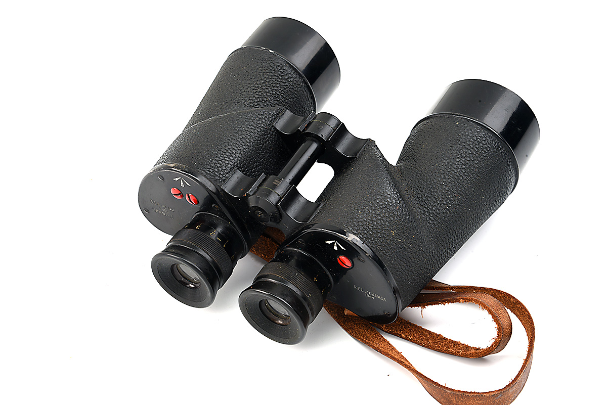 A GOOD PAIR OF CANADIAN WORLD WAR II MILITARY CASED BINOCULARS BY R. E. L., dated 1944, 7 X 50, frames 'Broad Arrow' marked, both eye-pieces focus correctly, images are clear, a little light wear, complete with brown leather neck-strap and reinforced buff leather case with brass fittings and strapping, belt-loop marked 'R. E. L. - CANADA', stitching solid, a little grazing