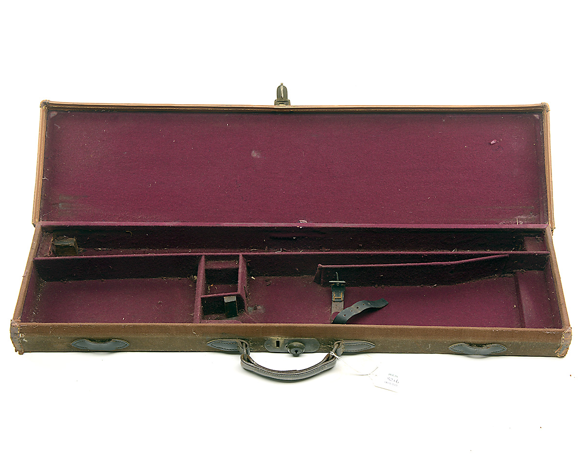 A BRADY TYPE BROWN CANVAS AND LEATHER SINGLE GUNCASE, fitted for 30in. barrels, the interior lined with maroon baize, brass lock (key missing)