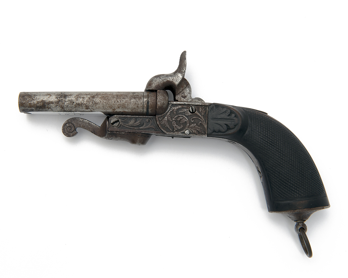 A 9mm PINFIRE DOUBLE-BARRELLED PISTOL, UNSIGNED, MODEL 'LEFAUCHEUX TYPE', no visible serial number, circa 1860, with tip-down 3in. side by side barrels, chisel engraved boxlock action with twin central hammers and folding triggers and chequered walnut butt, finish worn