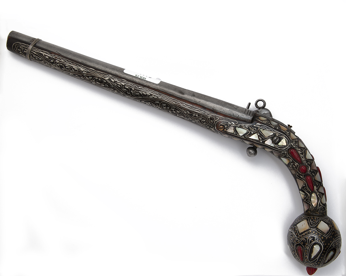 A 20-BORE MIQUELET LOCK RUSSIAN BALL-BUTTED PISTOL, UNSIGNED, no visible serial number made for the tourist market circa 1900, with plain round iron 12 1/2in. barrel, plain lock (does not hold on cock), walnut full-stock with prolific wire, mother of pearl and coral inlays and exposed ball trigger