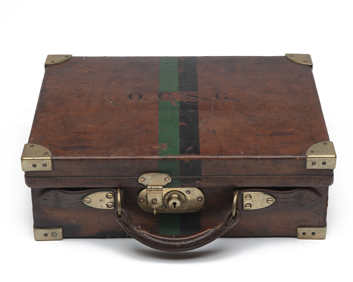 for approx. 250 cartridges, the lid interior lined with red baize, a Henry Atkin leather gold-tooled trade label, four removable dividers, five leather lifters, brass lock (key missing), the lid exterior embossed with the monogram 'O.C.S.G.'