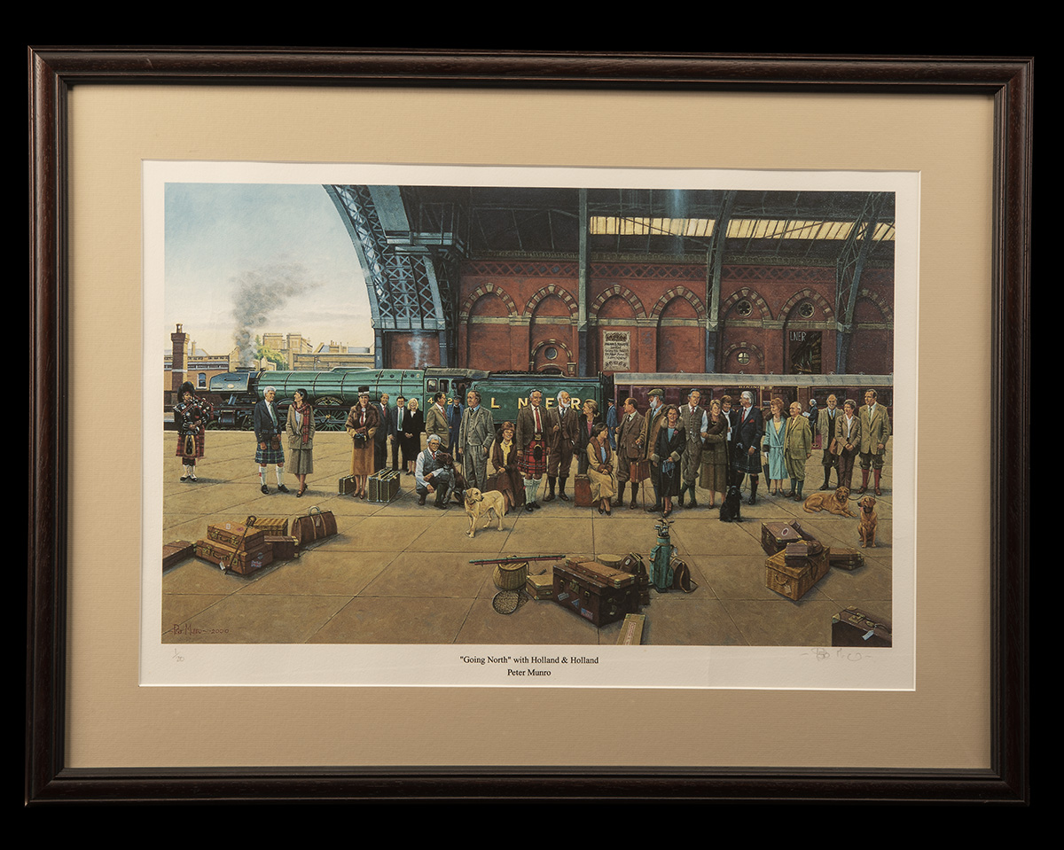 measuring approx. 40in. x 12in. white semi-circle with black, together with a framed print "GOING NORTH" with Holland & Holland' of the original painting by Peter Munro an Inverness based artist who was commissioned to paint a picture showing the group preparing to board the train at St Pancras station and he reflected the scenes shown in the famous pictures "Going North" painted one hundred and twenty years previously, measuring approx. 31 1/2in. x 24in., together with a photograph of the sign on the front of The Flying Scotsman