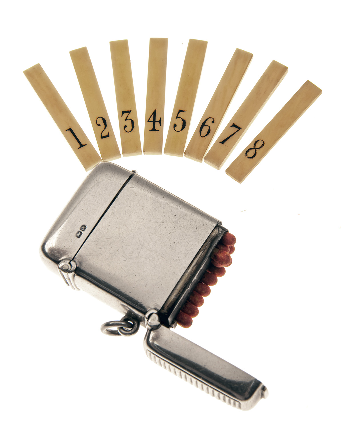 Chester hallmarks for 1901, 'J.M.B.' makers mark (1863-1926), sprung hinged top and bottom, the top opens to reveal eight numbered ivorine rectangular markers, the bottom (with striker) with match compartment, with suspension ring