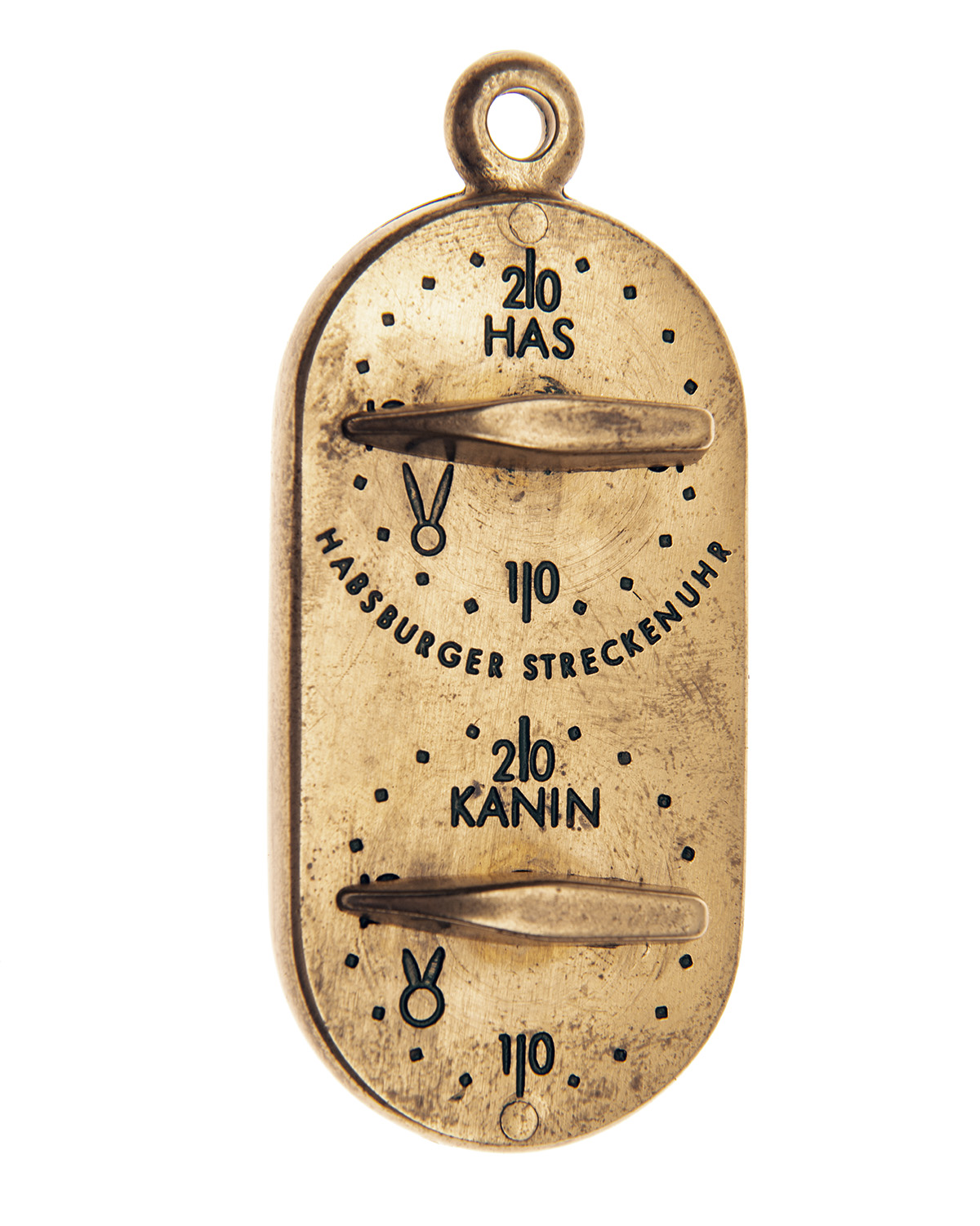 of 1980's manufacture, brass finish overall, four ratchet dials, the front and rear plates marked 'FASAN', 'HUHN', 'HAS' and 'KANIN', and each dial numbered to 20 on the plates and with a stylised depiction of the indicated quarry, centrally engraved '1801 PUMA GERMANY' and 'HABSBURGER STRECKENUHR', suspension ring