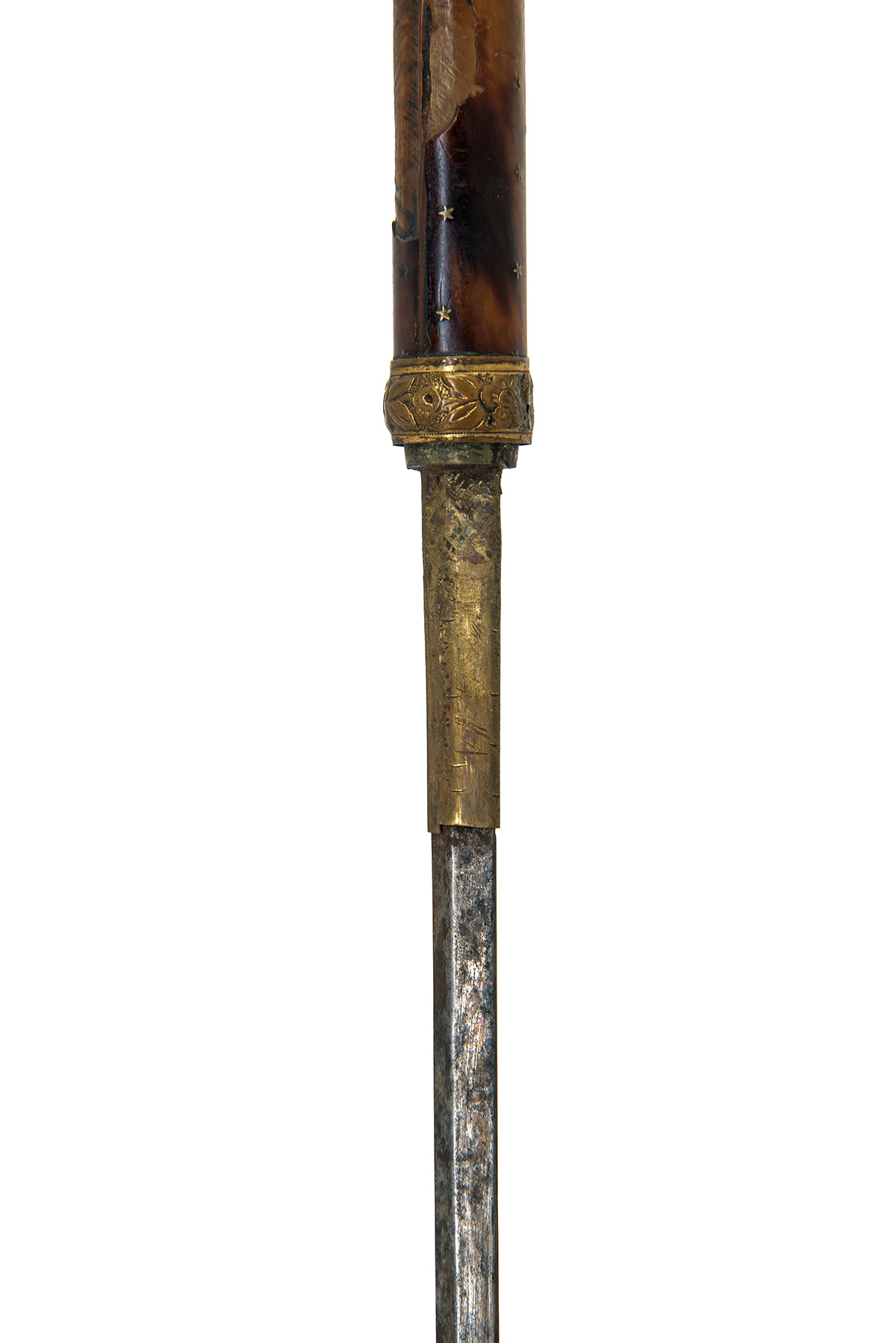 circa 1860, with 26in. blade of flat diamond cross-section (traces of blue and gilt decoration), brass mount at forte, engraved ferrule with scabbard lock (lock defective, traces of gilding), horn handle moulded in the form of a horse's leg and hoof, in a malacca cane scabbard