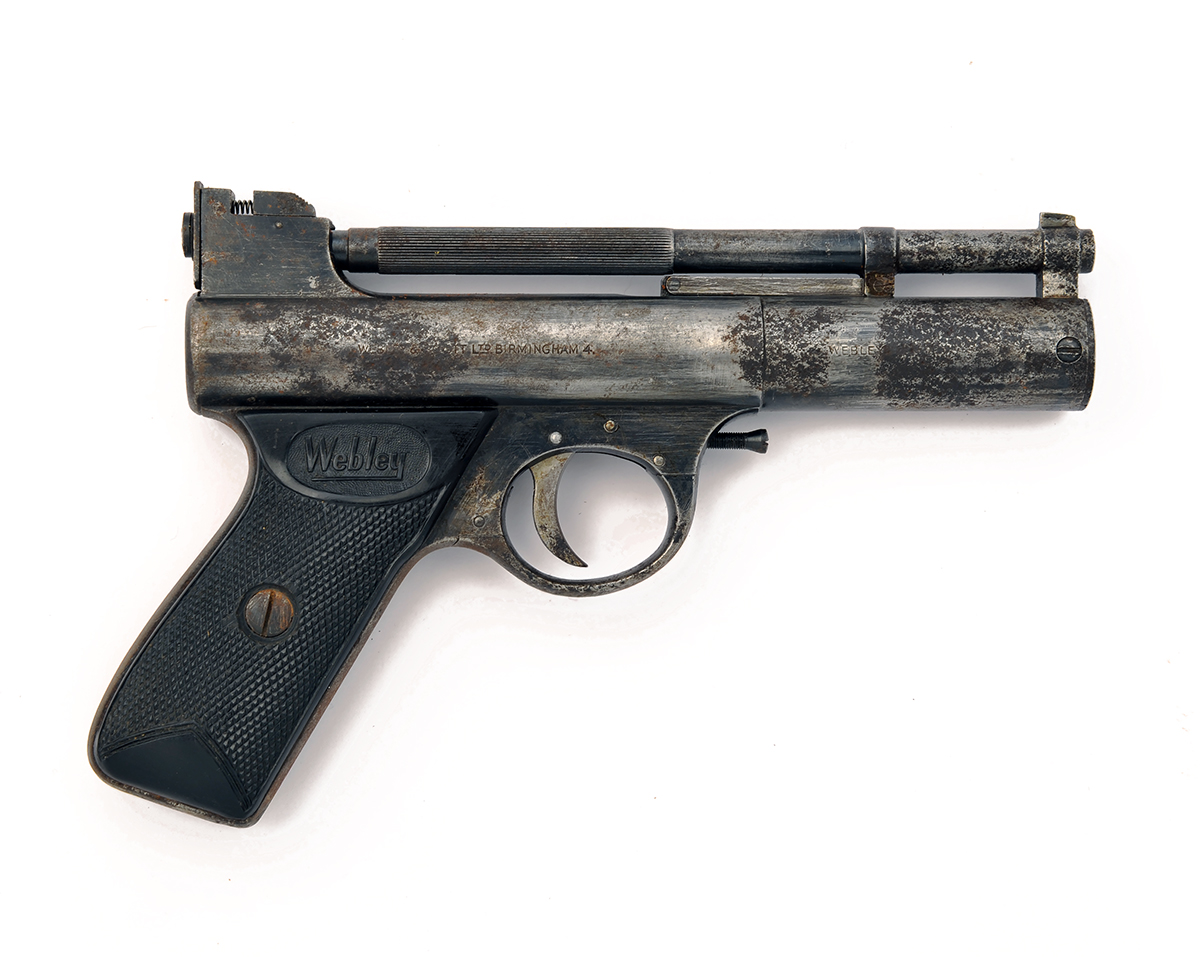 A .22 BARREL-COCKING AIR-PISTOL SIGNED WEBLEY & SCOTT, MODEL 'POST WAR MKI', batch no. 678, with 6 5/8in. barrel, stepped receiver and chequered hard rubber grips, finish badly worn